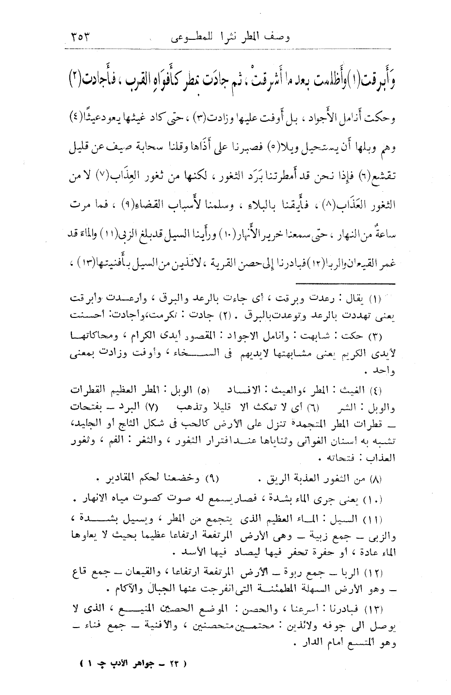 وأبرقت وأظلمت بعدما أشرقت ثم جادت لمطر كأفواه القرب فأجادت وحكت أنامل الأجواد بل أوفت عليها وزادت حتى كاد غيثها يعود عيثاً وهم وبلها أن يستحيل ويلاً فصبرنا على أذاها وقلنا: "سحابة صيف عن قليل تقشع" فإذا نحن بها قد أمطرتنا برداً كالثغور لكنها من ثغور العذاب لا من ثغور العذاب فأيقنا بالبلاء وسلمنا لأسباب القضاء فما فرت ساعة من النهار حتى سمعنا خرير الأنهار ورأينا السيل قد بلغ الزبى والماء قد غمر القيعان والربا فبادرنا إلى حصن القرية لائذين من السيل بأفنيتها وعائذين