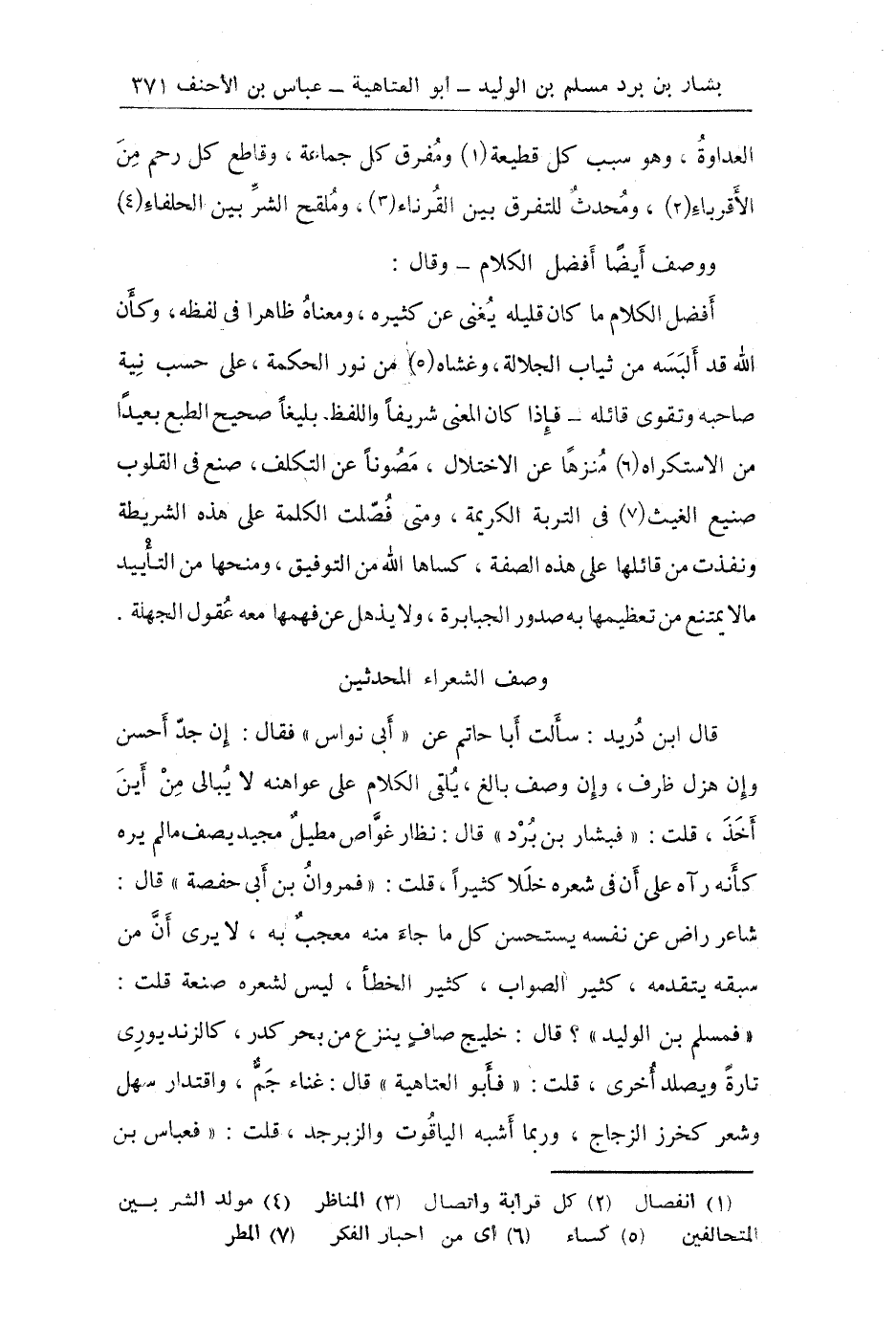 قال ابن دريد سألت أبا حاتم عن أبي نواس إن جد أحسن وغن هزل ظرف وإن وصف بالغ يلقي الكلام على عواهنه لا يبالي من أين أخذه قلت فبشار بن برد قال نظار غواص مطيل مجيد يصف ما لم ير كأنه رآه على أن في شعره خللاً كثيراً، قلت فمروان بن أبي حفصة قال شاعر راض عن نفسه يستحسن كلما جاء منه معجب لا يرى أن أحداً يتقدمه كثير الصواب كثير الخطأ ليس لشعره صنعة، قلت فمسلم بن الوليد قال خليج صاف ينزع من بحر كدر كالزند يوري تارة ويصلد أخرى، قلت فأبو العتاهية، قال غثاء جم واقتدار سهل وشعر كخرز الزجاج وربما أشبه الياقوت والزبرجد، قلت