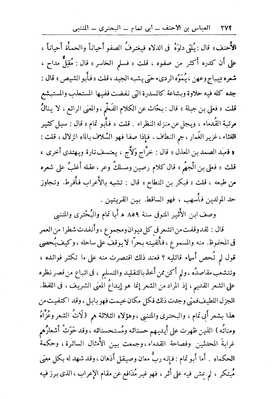 فعباس بن الأحنف قال يلقي دلوه في الدلاء فيغترف الصفو أحياناً والحماة أحياناً على أن كدره أكثر من صفوه، قلت فمسلم الخاسر، قال مقل مداح شعره ديباج وعهن يموه الرديء حتى يشبه الجيد، قلت فأبو الشيص قال جده كله فيه حلاوة وبشاعة كالسدرة التي نفضت ففيها المستعذب والمستبشع قلت فعلي بن جبلة قال بحاث عن الكلام الفخم والمعنى الرائع لا ينال مرتبة القدماء ويجل عن منزلة النظراء، قلت فأبو تمام قال سيل كثير الغثاء غزير الغمار جم النطاف فإذا صفا فهو السلاف بالماء الزلال، قلت فعبد الصمد بن المعذل قال خراج ولاج يعتسف تارة ويهتدي أخرى، قلت فعلي بن الجهم، قال كلام رصين ومسلك وعر عقله أغلب على شعره من طبعه قلت فبكر بن النطاح قال تشبه بالأعراب فأفرط وتجاوز حد المولدين فأسهب فهو الساقط بين القريتين.