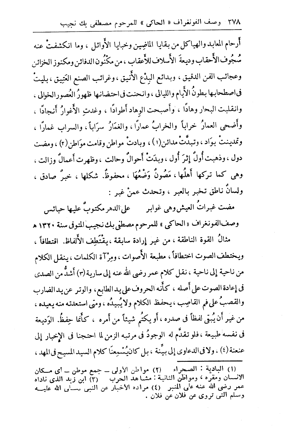 أرحام المعابد والهياكل من بقايا الماضين وخبايا الأوائل وما انكشفت عنه سجوف الأحقاب وديعة الأسلاف للأعقاب من مكنون الدفائن ومكنوز الخزائن وعجائب الفن الدقيق وبدائع البدع الأنيق وغرائب الصنع العتيق بليت في أصطحابها بطون الأيام والليالي وانحنت في احتضانها ظهور العصور الخوالي وانقلبت البحار وهادا وأصبحت الوهاد أطواداً وغدت الأغوار أنجاداً وأضحى العمار خراباً والخراب عماراً والغمار سراباً والسراب غماراً وتمدينت بواد وتبدت مدائن وبادت مواطن وقامت مواطن ومضت دول بعد دول وذهبت أول أثر أول وبدت أحوال وحالت وظهرت أعمال وزالت وهي كما تركها مصون وضعها محفوظ شكلها خبر صادق ولسان ناطق تخبر بالعبر وتحدث عمن غبر.