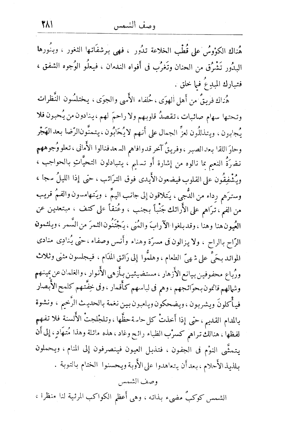 هناك الكؤوس على قطب الخلاعة تدور فهي برشفاتها الثغور وبنورها البدور تشرق من الحنان وتغرب في أفواه الندمان فيعلو الوجوه الشفق فتبارك المبدع فيما خلق.