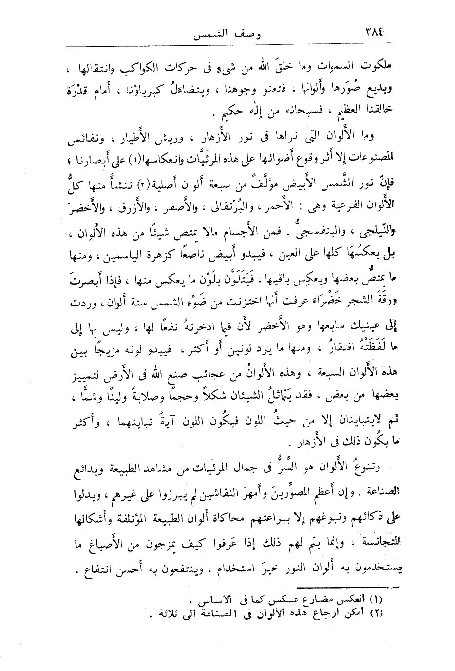 وما الأولان التي نراها في نور الأزهار وريش الأطيار ونفائس المصنوعات إلا أثر وقوع أضوائها على هذه المرئيات وانعكاسها على أبصارنا، فإن نور الشمس الأبيض مؤلف من سبعة ألوان أصلية تنشأ منها كل الأولان الفرعية، وهي الأحمر، والبرتقالي، والأصفر، والأزرق، والأخضر، والنيلجي، والبنفسجي، فمن الأجسام ما لا يمتص شيئاً من هذه الأولان، بل يعكسها كلها على العين، فيبدو أبيض ناصعاً كزهرة الياسمين، ومنها ما يمتص بعضها ويعكس باقيها، فيتلون بلون ما يعكس منها، فإذا أبصرت ورقة الشجر خضراء عرفت أنها اختزنت من ضوء الشمس ستة ألوان، وردت إلى عينيك سابعها، وهو الأخضر لن فيما أدخرته نفعاً لها، وليس بها إلى ما لفظته افتقاراً، ومنها ما يرد لونين أو أكثر، فيبدو لونه مزيجاً بين هذه الأولان السبعة، وهذه الأولان من عجائب صنع الله في الأرض لتمييز بعضها من بعض فقد يتماثل الشيئان شكلاً، وحجماً، وصلابة، وليناً، وشمأ ثم لا يتباينان إلا من حيث اللون، فيكون اللون آية تباينهما، وأكثر ما يكون ذلك في الأزهار.