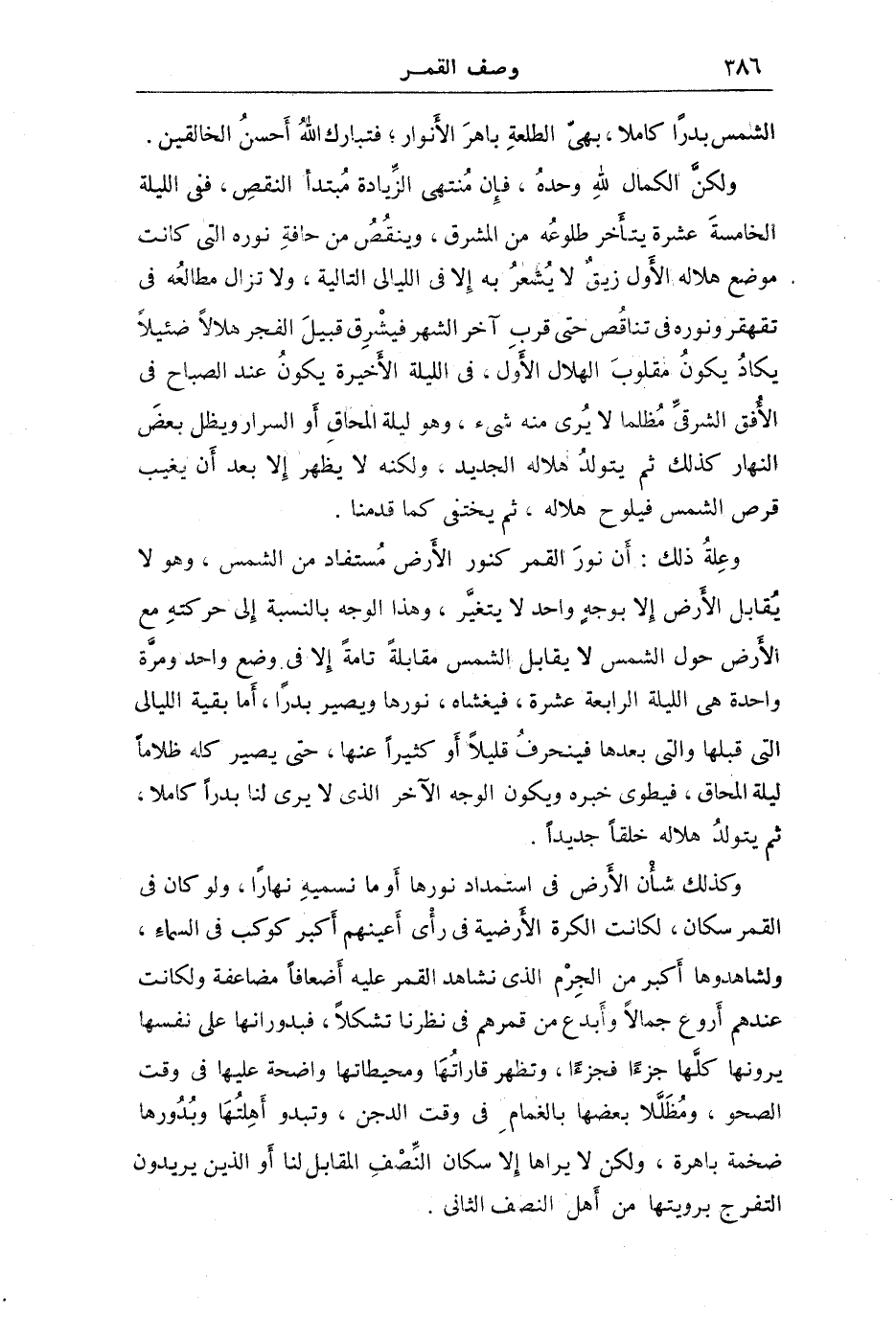 وكذلك شأن الأرض في استمداد نورها أو ما نسميه نهاراً، فلو كان في القمر سكان لكانت في رأي أعينهم أكبر كوكب في السماء، ولشاهدوها أكبر من الجرم الذي نشاهد القمر عليه أضعافاً مضاعفة، لكانت عندهم أروع جمالاً وأبدع من قمرهم في نظرنا تشكلاً، فبدورانها على نفسها يرونها كلها جزءاً فجزءاً، وتظهر قارتها ومحيطاتها واضحة عليها في وقت الصحو ومظللاً بعضها بالغمام في وقت الدجن، وتبدو أهلتها وبدورها ضخمة باهرة ولكن لا يراها إلا سكان النصف المقابل لنا أو الذين يريدون التفرج برؤيتها من أهل النصف الثاني.