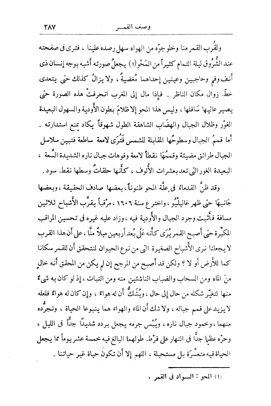 ولقرب القمر منا وخلو جوه من الهواء سهل رصده علينا، فنرى في صفحته عند الشروق ليلة التمام كثيراً من المحو، يجعل صورته أشبه بوجه إنسان ذي أنف وفم وحاجبين وعينين إحداهما مغضية، ولا يزال كذلك، حتى يتعدى خط زوال مكان الناظر، فإذا مال إلى المغرب انحرفت هذه الصورة حتى يصير عاليها سافلها، وليس هذا المحو إلا ظلام بطون الأودية والسهول البعيدة الغور وظلال الجبال والهضاب الشاهقة الطول شهوقاً يكاد يمنع استدارته أما قمم الجبال وسطوحها المقابلة للشمس فترى لامعة ساطعة فتبين سلاسل الجبال طرائق مضيئة وقممها نقطاً لامعة وفوهات جبال ناره الشديدة السعة البعيدة الغور التي تعد بعشرات الألوف كأنها حلقات وسطها نقط سود.