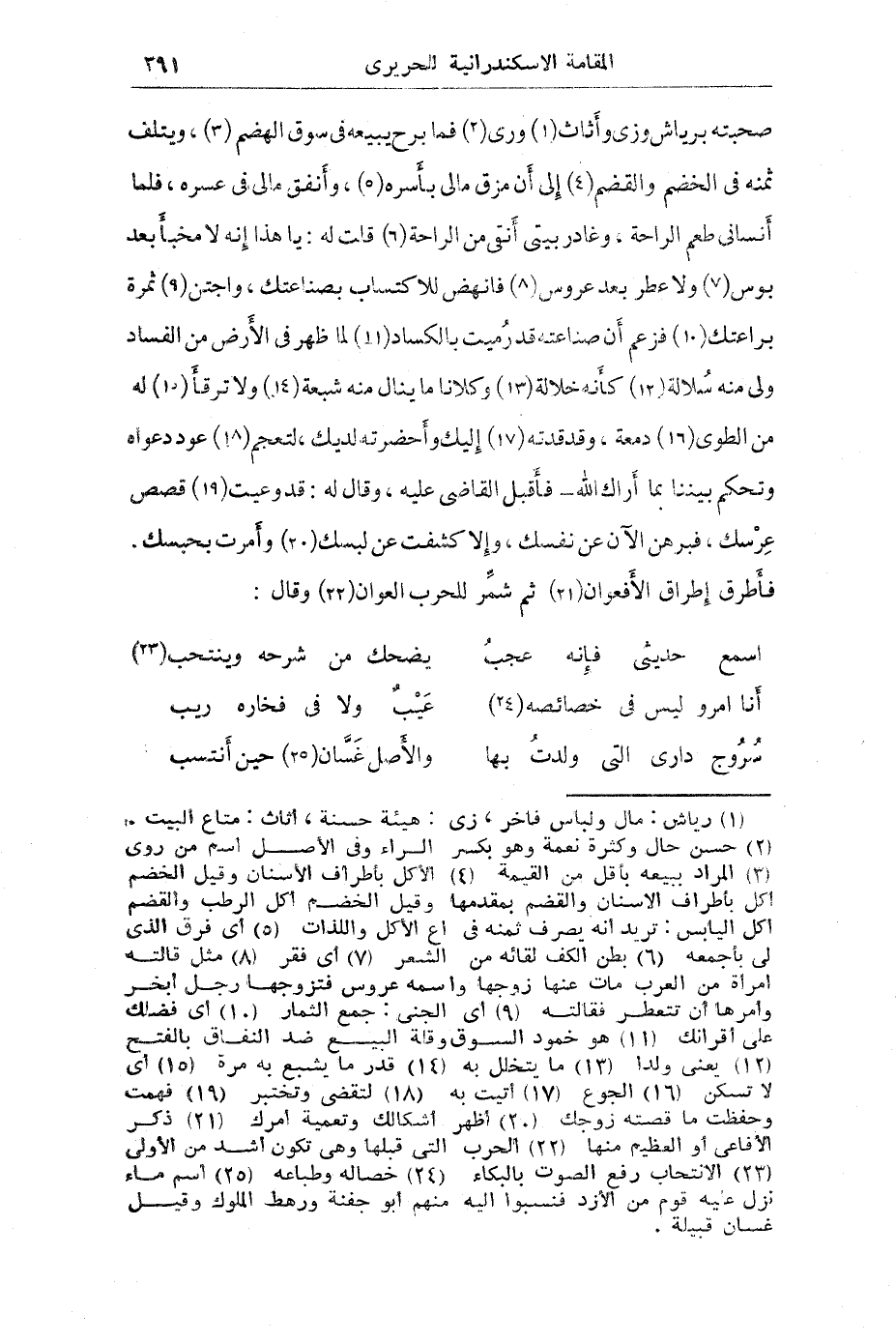 وكنت صحبته برياش وزي وأثاث وري فما برح يبيعه في سوق الهضم ويتلف ثمنه في الخصم والقضم إلى أن مزق مالي بأسره وأنفق مالي في عسره فلما أنساني طعم الراحة وغادر بيتي أنقى من الراحة قلت له يا هذا أنه لا مخبأ بعد بوس ولا عطر بعد عروس فانهض للاكتساب بصناعتك واجتني ثمرة براعتك فزعم أن صناعته قد رميت بالكساد لما ظهر في الأرض من الفاسد زلي منه سلالة كأنه خلالة وكلانا ما ينال معه شبعة ولا ترقا له من الطوى دمعة وقد قدته إليك وأحضرته لديك لتعجم عود دعواه وتحكم بيننا بما أراك الله فأقبل القاضي عليه وقال له وعيت قصص عرسك فبرهن الآن عن نفسك وإلا كشفت عن لبسك وأمرت بحسبك فأطرق إطراق الأفعوان ثم شمر للحرب العوان وقال: