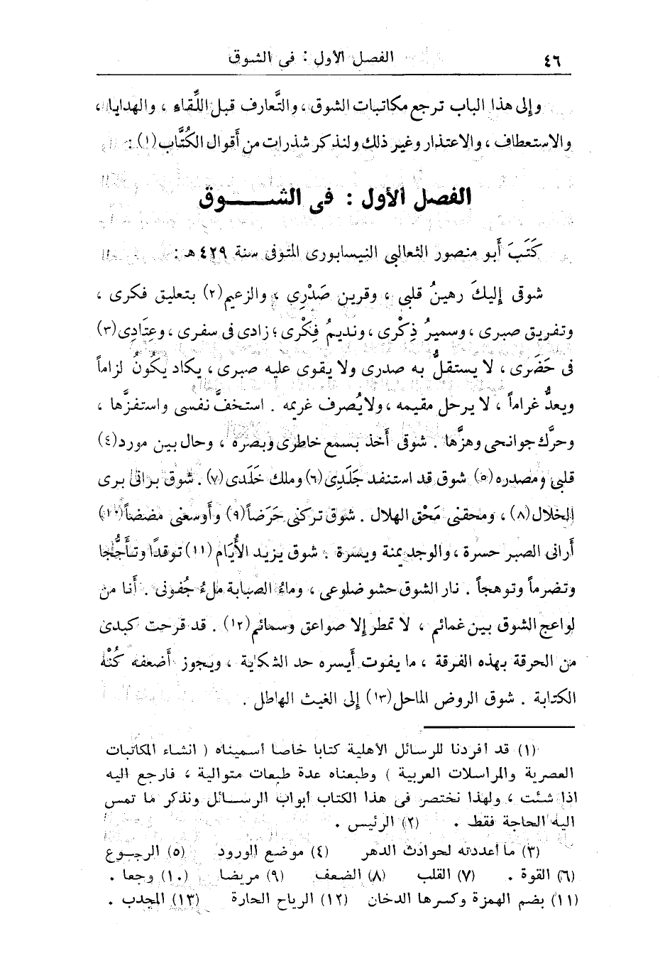 شوقي إليك رهين قلبي وقرين صدري والزعيم بتعليق فكري وتفريق صدري سمير ذكري ونديم فكري زادي في سفري. وعتادي في حضري لايستقل به ولايقوى عليه صبري يكاد يكون لزاما ويعد غراما لا يرحل مقيمخ ولا يصرف غريمه استخف نفسي واستفرها وحرك جوانحي وهزها شوق أخذ بسمع خاطري وبصره وحال بين مورد قلبه ومصدره شوق قد استنفذ جلدي وملك خلدي شوق براني بري الخلال ومحقني محق الهلال شوق تركني حرضا وأوسعني مضضا أراني الصبر حسرة والوجد يمنة ويسرة شوق يزيد على الإيام توقدا وتأججا وتضرما وتوهجا نار الشوق حشو ضلوعي وماء الصبابة ملء جفوني أنا من لواعج الشوق بين غمائم لاتمطر إلا صواعق وسمائم قد قدحت في كبدي من الحرقة بهذه الفرقة ما يفوت أيسره حد الشكاية ويجوز أضعفه كنه الكناية. شوق الروض الماحل إلى الغيث الهاطل.