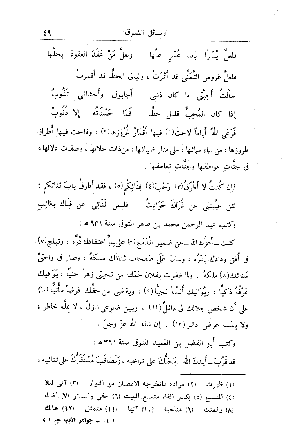 فرعى الله أياما لاحت فيها أقمار غروزها. وفاحت فيها أطراز طروزها. بهاء سمائها. على منار ضيائها. من ذات جلالها. وصفات دلالها. في جنات عواطفها. وحنات تعاطفها.