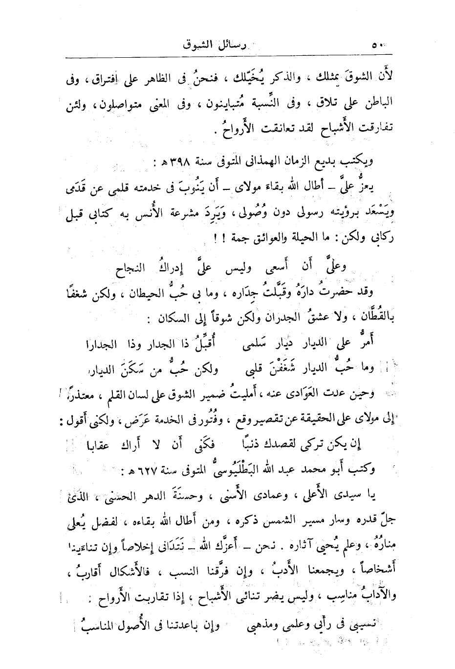 تنائيه لأن الشوق يمثلك. والذكر يخيلك. فنحن في الظاهر على افتراق. وفي الباطن على تلاق. وفي النسبة متباينون. وفي المعنى متواصلون. ولئن تفارقت الأشباح لقد تعانقت الأرواح.