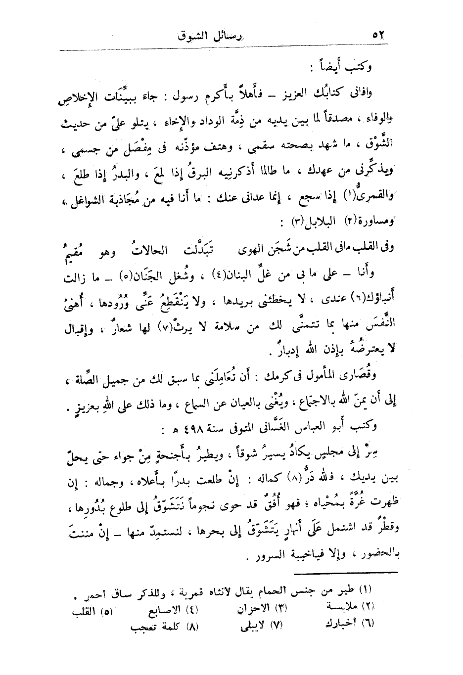 وافاني كتابك العزيز فأهلاً بأكرم رسول جاء ببينات الإخلاص والوفاء مصدقاً لما بين يديه من ذمة الوداد والإخاء. يتلو علي من حديث الشوق ما شهد بصحته سقمي. وهتف مؤذنه في كل مفصل من جسمي ويذكرني من عهدك ما طالما أذكرينه البرق إذا لمع والبدر إذا طلع والقمري إذا سجع. وإنما عداني عنك ما أنا فيه من مجاذبة الشواغل ومساورة البلابل.