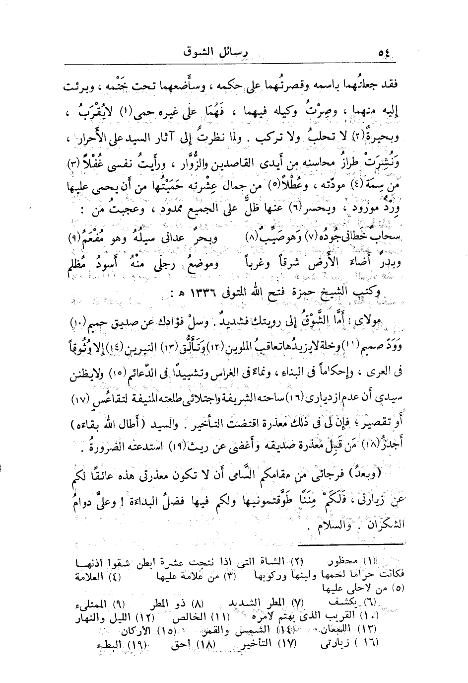 مولاي: أما الشوق إلى رؤيتك فشديد وسل فؤادك عن صديق حميم وود صميم وخله لا يزيدها تعاقب الملوين وتألق النيرين إلا وثوقاً في العرى وإحكاماً في البناء ونماء في الغراس وتشييداً في الدعائم ولا يظنن سيدي أن عدم ازديادي ساحته الشريفة واجتلائي طلعته المنيفة لتقاعس أو تقصير فإن لي في ذلك معذرة اقتضت التأخير والسيد أطال الله بقاءه أجدر من قبل معذرة صديقه وأغضى عن ريث استدعته الضرورة.. وبعد فرجائي من مقامكم السامي أن لا تكون معذرتي هذه عائقاً لكم عن زيارتي: فلكم مننا طوقتمونيها ولكم فيها فضل البداءة وعلي دوام الشكران والسلام.