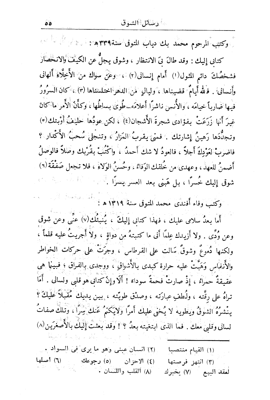 كتابي إليك: وقد أطال بي الانتظار وشوقي يجل عن الكيف والانحصار فشخصك دائم المثول أمام إنساني وعن سواك من الأخلاء ألهاني وأنساني فلله أيام قضيناها وليال من الدهر اختلسناها كان السرور فيها ضارباً خيامه والأنس ناشراً أعلامه طوي بساطها وكأن الأمر ما كان غير أنها زرعت بفؤادي شجرة الأشجان لكن عودها حليف أوبتك وتجددها رهين إشارتك فمتى يقرب المزار وتنجلي سحب الأكدار فاضرب لعودك أجلاً فالعود لاشك أحمد واكتب بقربك وصلا فالوصل اضمن للعهد: وعهدي من خلقك الوفاء وحسن الولاء فلا تجعل صفقة شوقي إليك خسراً بل هبني بعد العسر يسرا.