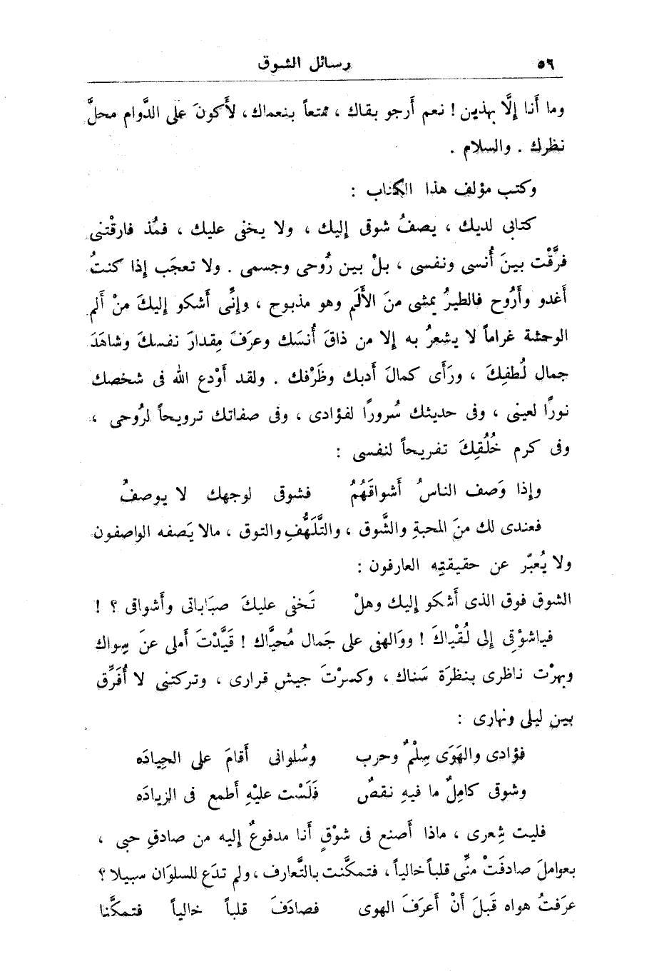 فليت شعري ماذا أصنع في شوق أنا مدفوع إليه من صادق حبي بعوامل صادفت مني قلباً خالياً فتمكنت بالتعارف ولم تدع للسلوان سبيلاً.