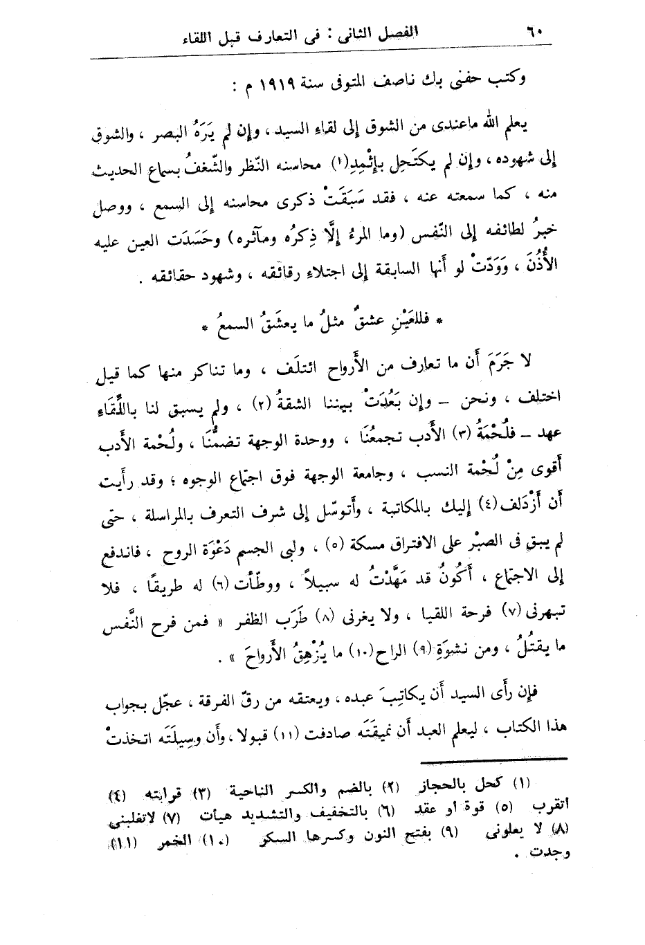 يعلم الله ما عندي من الشوق إلى لقاء السيد وإن لم يكتحل بإثمد محاسنه النظر والشغف بسماع الحديث منه كما سمعته عنه فقد سبقت ذكرى محاسنه إلى السمع ووصل خبر لطائفة إلى النفس. وما المرء إلا ذكره ومآثره. وحسدت العين عليه الأذن وودت لو أنها السابقة إلى اجتلاء رقائقه وشهود حقائقه.