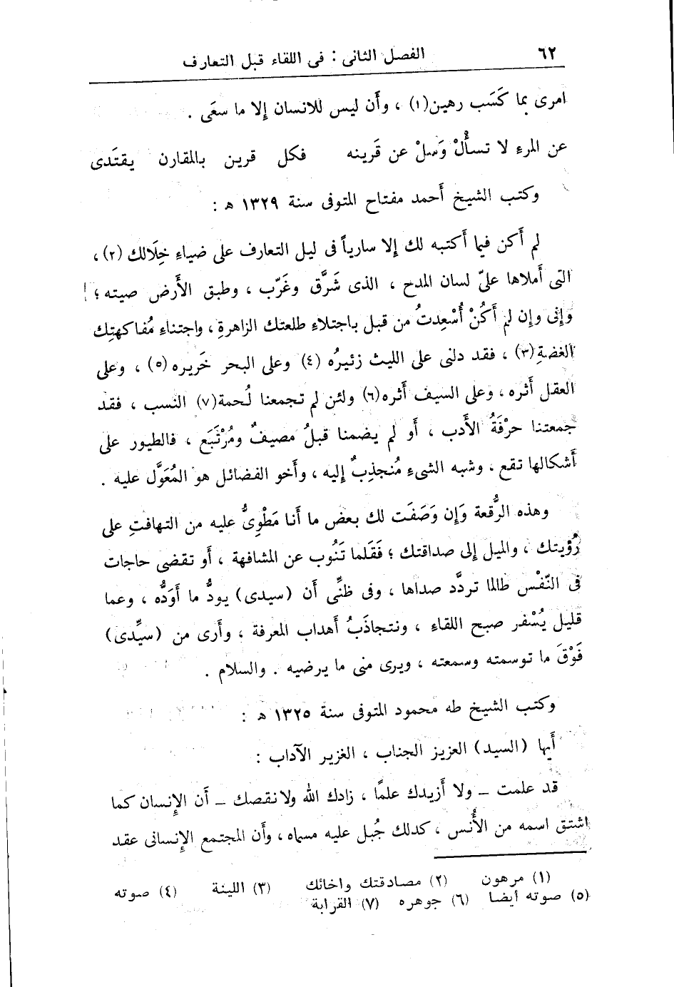 لم أكن فيما أكتبه لك إلا سارياً في ليل التعارف على ضياء خلالك التي أملاها علي لسان المدح الذي شرق وغرب الأرض صيته وإني وإن لم أكن أسعدت من قبل باجتلاء طلعتك الزاهرة واجتناء مفاكهتك الغضة فقد دلني على الليث زئيره وعلى البحر خريره وعلى العقل أثره وعلى السيف إثره ولئن لم تجمعنا لحمة النسب فقد جمعتنا حرفة الأدب أو لم يضمنا قبل مصيف ومرتبع فالطيور على أشكالها تقع وشبه الشيء منجذب إليه وأخو الفضائل هو المعول عليه: وهذه الرقعة وإن وصفت لك بعض ما أنا مطوي عليه من التهافت على رؤيتك والميل إلى صداقتك فقلما تنوب عن المشابهة أو تقضي حاجات في النفس طالما تردد صداها: زفي ظني أن سيدي يود ما أوده وعما قليل يسفر صبح اللقاء ونتجاذب أهداب المعرفة: ورأى من سيدي فوق ما توسمته وسمعته ويرى مني ما يرضيه والسلام.