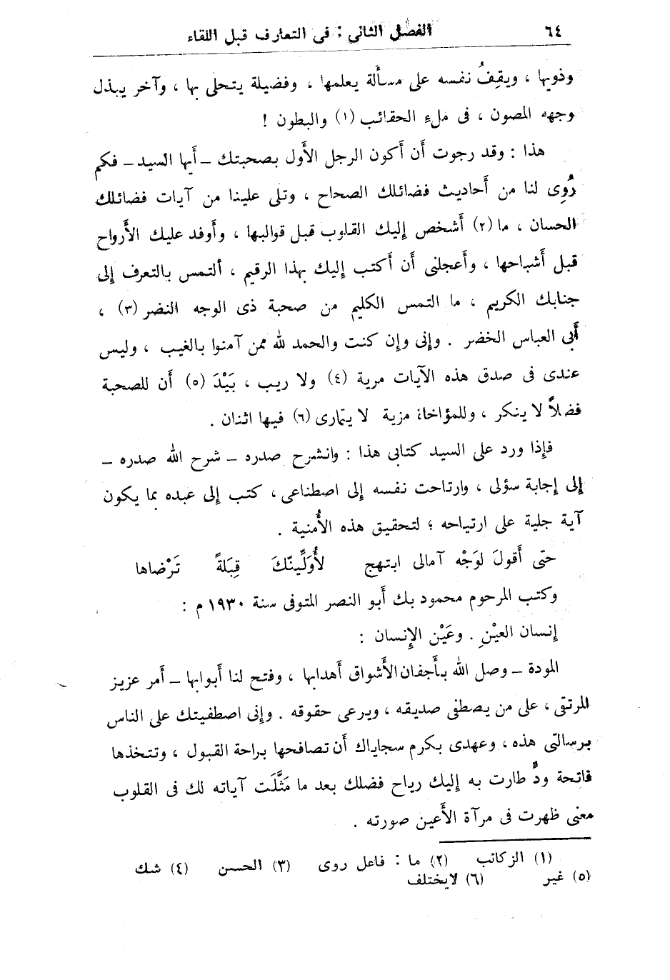 هذا: وقد رجوت أن أكون الرجل الأول بصحبتك "أيها السيد" فكم روى لنا من أحاديث فضائلك للصحاح وتلى علينا من آيات شمائلك الحسان ما أشخص إليك القلوب قبل قوالبها وأوفد عليك الأرواح قبل أشباحها وأعجلني أن أكتب إليك بهذا الرقيم ألتمس بالتعرف إلى جنابك الكريم ما ألتمس الكليم من صحبة ذي الوجه النضر أبي العباس الخضر وإني وإن كنت والحمد لله ممن آمنوا بالغيب وليس عندي في صدق هذه الآيات مرية ولا ريب: بيد أن للصحبة فضلاً لا ينكر وللمؤاخاة مزية لا يتمارى فيها اثنان.