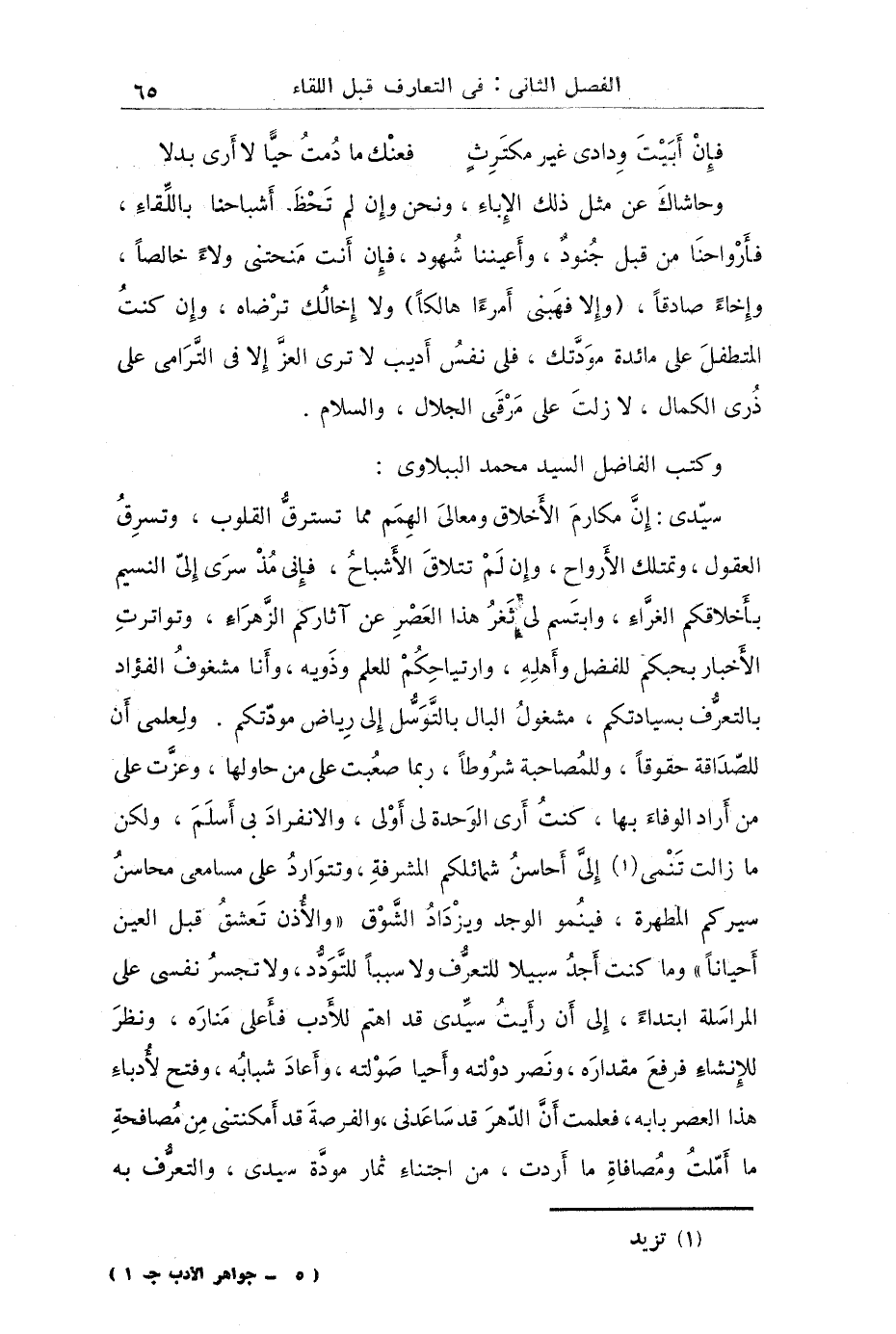 سيدي إن مكارم الأخلاق ومعالي الهمم مما تسترق القلوب وتسترق العقول وتمتلك الأرواح وإن لم تتلاق الأشباح فإني مذ سرى إلي النسيم بأخلاقكم الغراء وابتسم لي ثغر هذا العصر عن آثاركم الزهراء وتواترت الأخبار بحبكم للفضل وأهله وارتياحكم للعلم وذويه وأنا مشغوف الفؤاد بالتعرف بسيادتكم مشغول البال بالتوسل إلى رياض مودتكم ولعلمي أن للصداقة حقوقاً وللمصاحبة شروطاً ربما صعبت على من حاولها وعزت على من أراد الوفاء بها كنت أرى الوحدة أولى والانفراد بي أسلم ولكن ما زلت تنمي إلى أحاسن شمائلكم المشرفة وتتوارد على مسامعي محاسن سيركم المطهرة فينمو الوجد ويزداد الشوق "والأذن تعشق قبل العين أحياناً" وما كنت أجد سبيلاً للتعرف ولا سبباً للتودد ولا متجسر نفسي على المراسلة ابتداء إلى أن رأيت سيدي قد اهتم للأدب فأعلى منارة ونظر للإنشاء فرفع مقداره ونصر دولته وأحيا صولته وأعاد شبابه وفتح لأدباء هذا العصر بابه فعلمت أن الدهر قد ساعدني والفرصة قد أمكنتني من مصافحة أملت ومصافات ما أردت من اجتناء ثمار سيدي والتعرف به