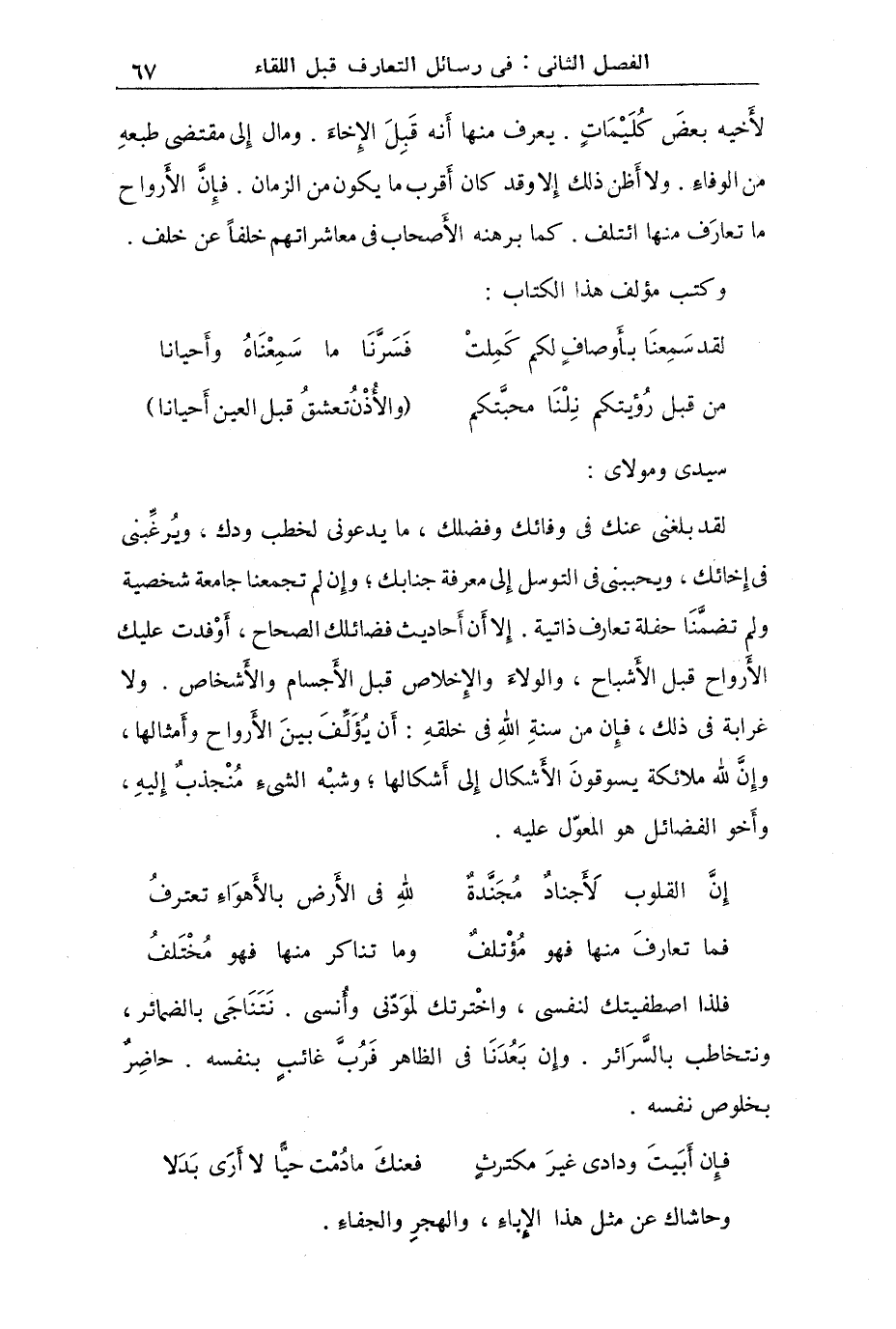 سيدي ومولاي: لقد بلغني عنك في وفائك وفضلك ما يدعوني لخطب ودك ويرغبني في إخائك ويحببني في التوسل إلى معرفة جنابك وإن لم تجمعنا جامعة شخصية ولم تضمنا حفلة تعارف ذاتية إلا أن أحاديث فضائلك الصحاح أوفدت عليك الأرواح قبل الأشباح والولاء والإخلاص قبل الأجسام والأشخاص ولا غرابة في ذلك فإن من سنة الله في خلقه أن يؤلف بين الأرواح وأمثالها وإن لله ملائكة يسوقون الأشكال إلى أشكالها وشبه الشيء منجذب إليه وأخو الفضائل هو المعول عليه.