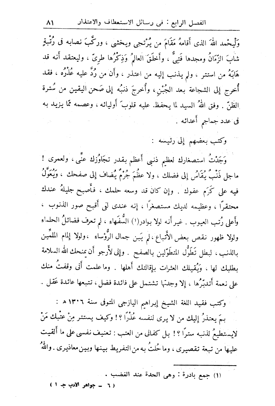 وجدت استصغارك لعظيم ذنبي أعظم بقدر تجاوزك عني ولعمري ما جل ذنب يقاس إلى فضلك ولا عظم جرم يضاف إلى صفحك ويعول فيه على كرم عفوك وإن كان قد وسعه حلمك فأصبح جليله عندك محتقراً وعظيمة لديك مستصغراً أنه عندي لفي أقبح صور الذنوب وأعلى رتب العيوب غير أنه لولا بوادر السفهاء لم تعرف فضائل الحلماء ولولا ظهور نقص بعض الأتباع لم يبن جمال الرؤساء ولولا إلمام الملمين لبطل تطول المتطولين بالصفح وغني لأرجو أن يمنحك الله السلامة بطلبك لها ويقيلك العثرات بإقالتك أهلها وما علمت أني وقفت منك على نعمة أتدبرها إلا وجدتها تشتمل على فائدة فضل تتبعها عائدة عقل.