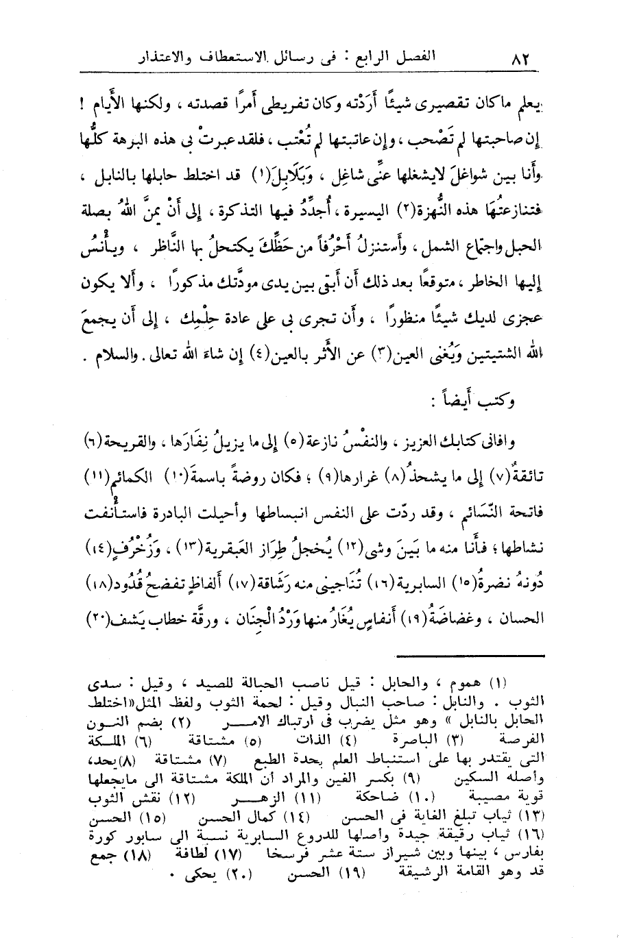 يعلم ما كان تقصيري شيئاً أردته ولا كان تفريطي أمراً قصدته ولكنها الأيام إن صاحبتها لم تصحب وإن عاتبتها لم تعتب فلقد عبرت بي هذه البرهة كلها وأنا بين شواغل لا يشغلها عني شاغل وبلابل قد اختلط حابلها بالنابل فنازعتها هذه النهزة اليسيرة أجدد فيها التذكرة إلى أن يمن الله بصلة الحبل واجتماع الشمل واستنزل أحرفاً من حظك يكتحل بها الناظر ويأنس إليها الخاطر متوقعاً بعد ذلك أن أبقى بين يدي مودتك مذكوراً وإلا يكون عجزي لديك شيئاً منظوراً وإن تجري بي على عادة حلمك إلى أن يجمع الله الشتيتين ويغني العين عن الأثر بالعين إن شاء الله تعالى والسلام.