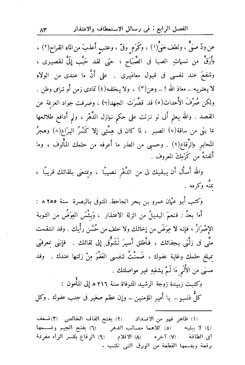 أما بعد فنعم البديل من الزلة الاعتذار وبئس العوض من التوبة الإصرار فأنا لا عوض من إخائك ولا خلف من حسن رأيك وقد انتقمت مني في زلتي بجفائك فأطلق أسير تشوقي إلى لقائك فإنني بمعرفتي بمبلغ حلمك وغاية ضمنت لنفسي العفو من زلتها عندك وقد مسني من الألم ما لم يشفه غير مواصلتك.