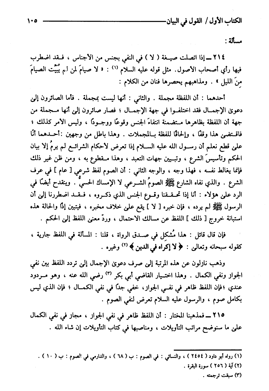 214- إذا اتصلت صيغة "لا" في النفى بجنس من الأجناس فقد اضطرب فيها رأى أصحاب الأصول مثل قوله عليه السلام:1 "لا صيام لمن لم يبيت الصيام من الليل", ومذاهبهم يحصرها فنان من الكلام.