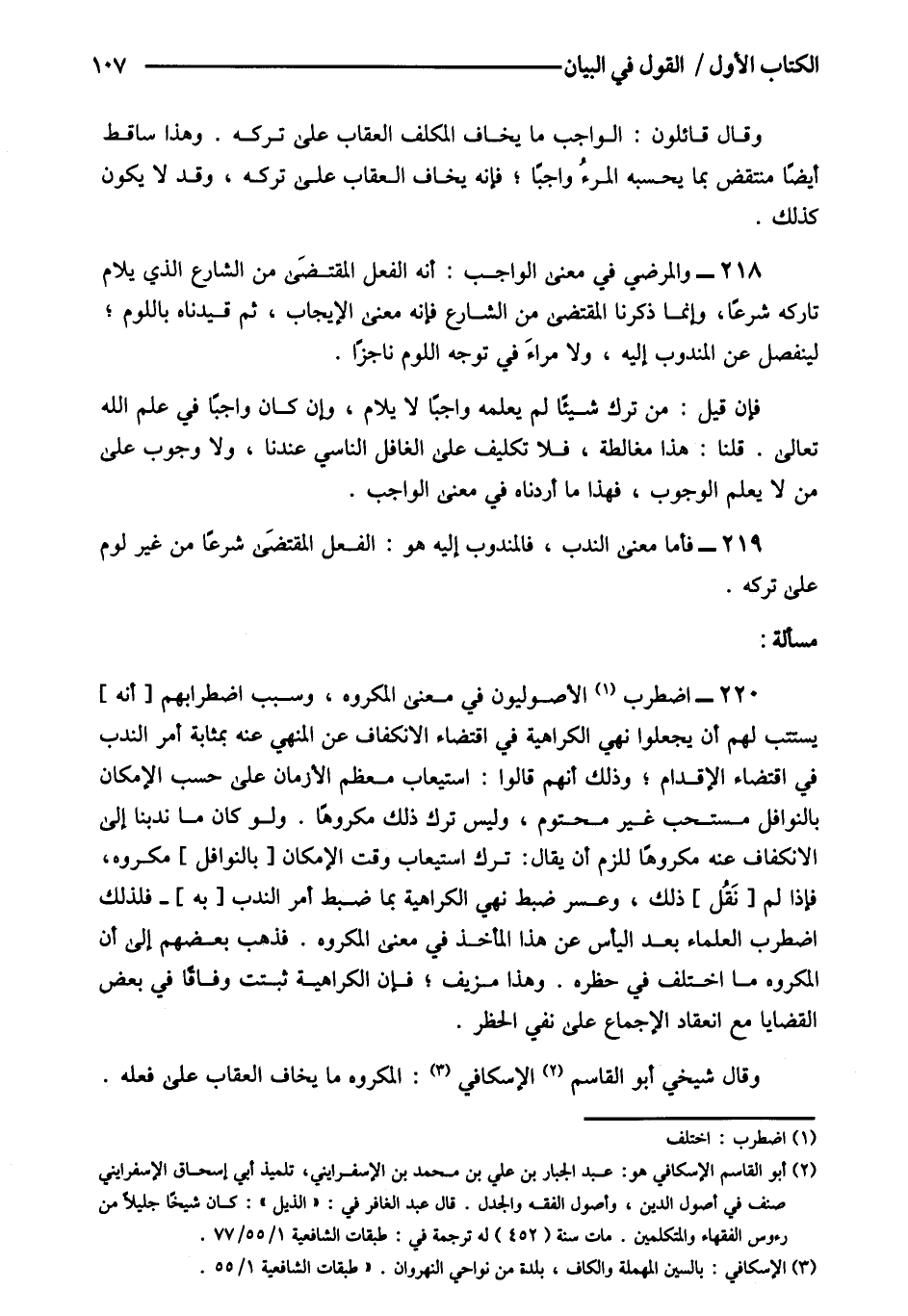 2 أبو القاسم الإسكافي هو: عبد الجبار بن علي بن محمد بن الإسفرايني تلميذ أبي إسحاق الإسفرايني صنف في أصول الدين وأصول الفقه والجل قال عبد الغافر في: "الذيل": كان شيخا جليلا من رءوس الفقهاء والمتكلمين مات سنة "452" له ترجمة في: طبقات الشافعية 1/55/77.