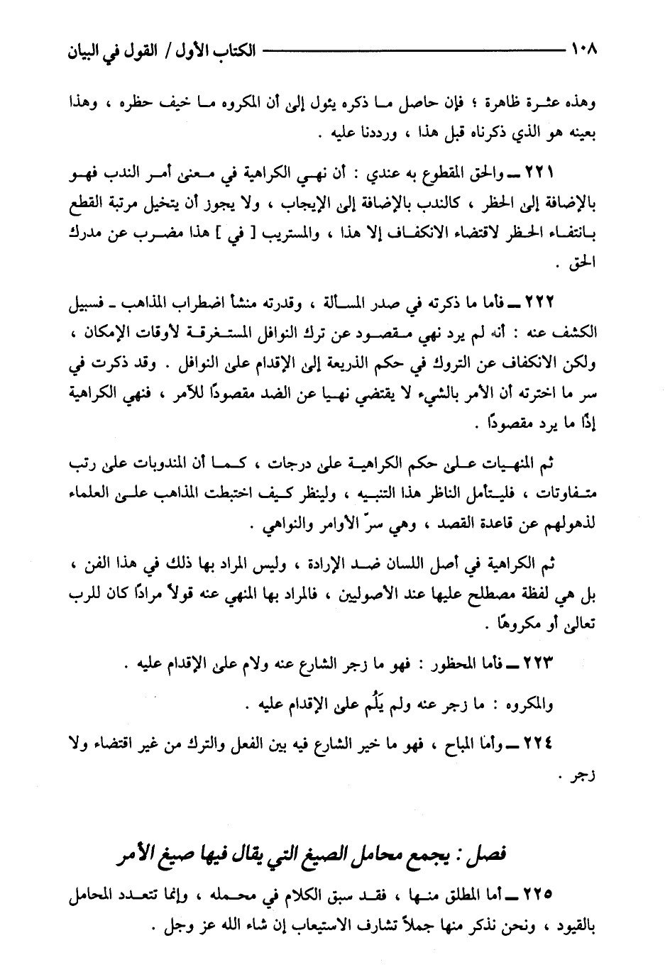 224- وأما المباح فهو ما خير الشارع فيه بين الفعل والترك من غير اقتضاء ولا زجر.