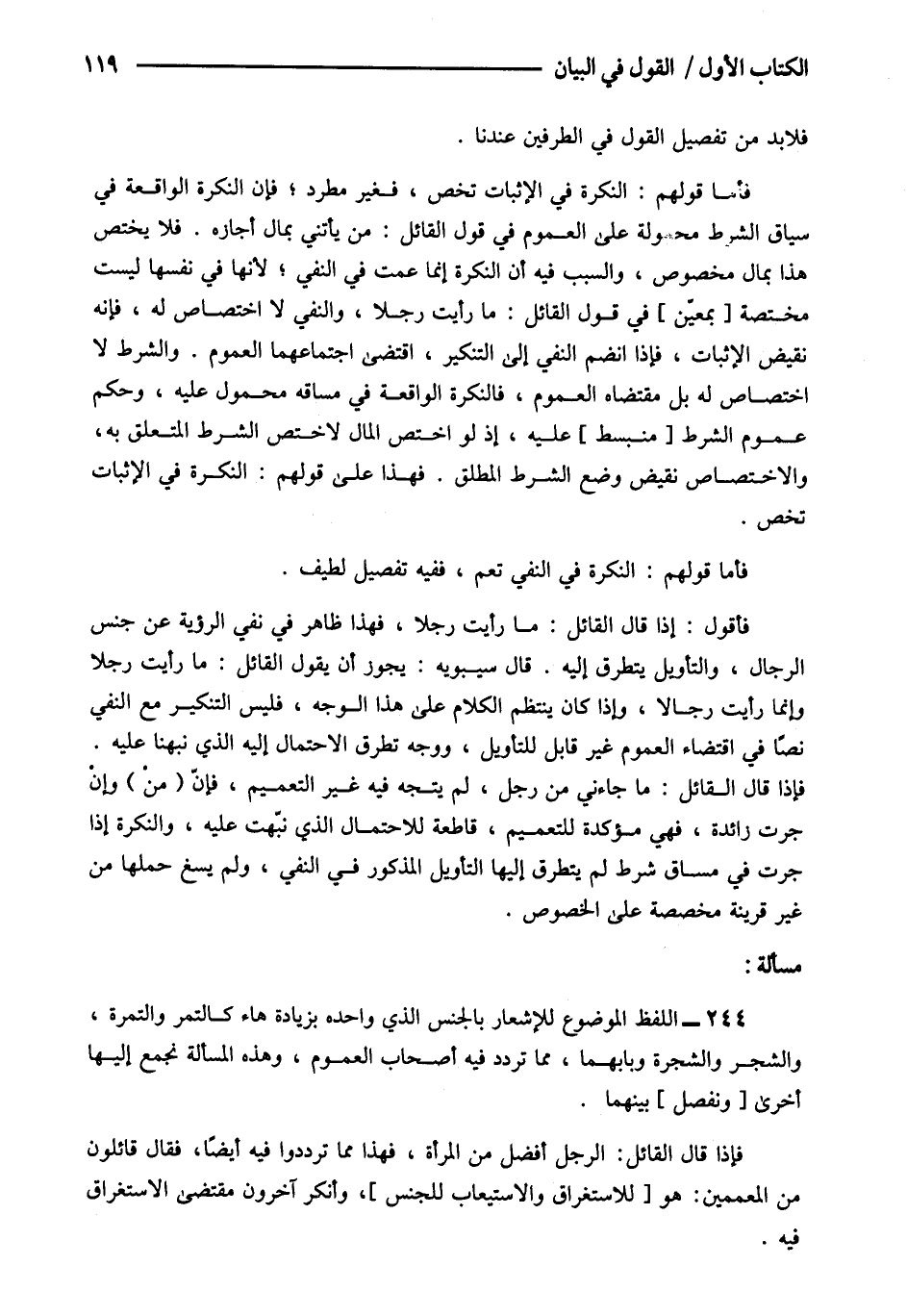 فإذا قال القائل: الرجل أفضل من المرأة فهذا مما ترددوا فيه أيضا فقال قائلون من المعممين: هو [للاستغراق والاستيعاب للجنس] وأنكر اخرون مقتضى الاستغراق فيه.