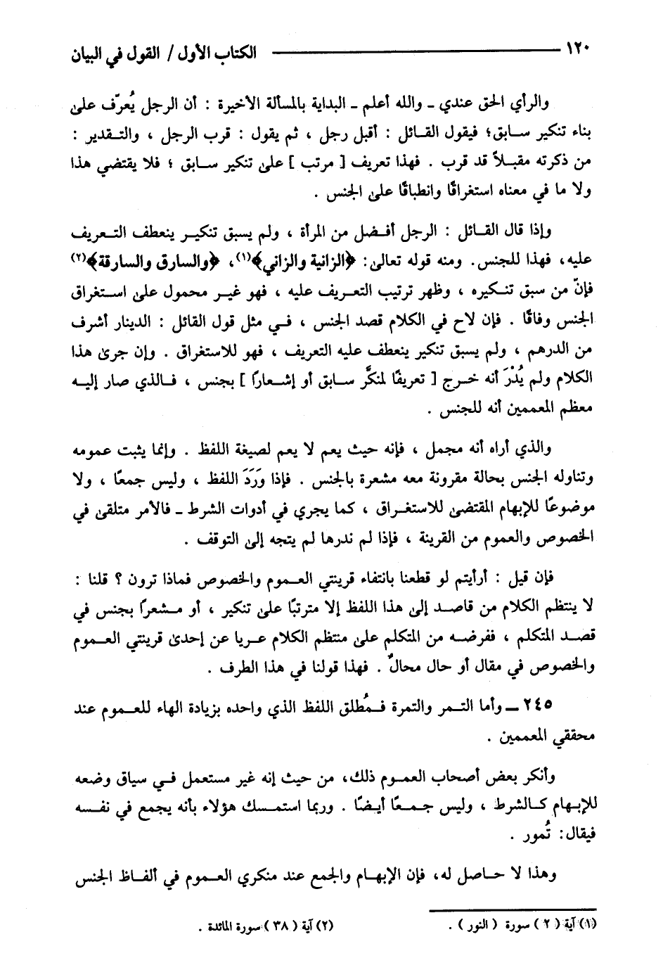 والرأي الحق عندي والله أعلم البداية بالمسألة الأخيرة أن الرجل يعرف على بناء تنكير سابق فيقول القائل أقبل رجل ثم يقول قرب الرجل والتقدير من ذكرته مقبلا قد قرب فهذا تعريف [مرتب] على تنكير سابق فلا يقتضي هذا ولا ما في معناه استغراقا وانطباقا على الجنس.