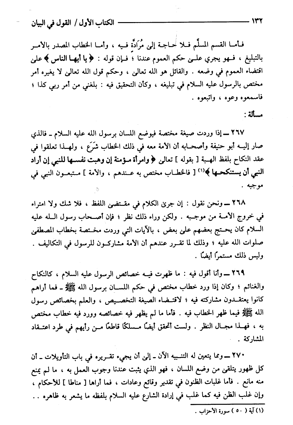 268- ونحن نقول إن جرى الكلام في مقتضى اللفظ فلا شك ولا امتراء في خروج الأمة من موجبه ولكن وراء ذلك نظر فإن أصحاب رسول الله عليه السلام كان يحتج بعضهم على بعض بالآيات التي وردت مختصة بخطاب المصطفى صلوات الله عليه وذلك لما تقرر عندهم أن الأمة مشاركون للرسول في التكاليف وليس ذلك مستمرا أيضا.