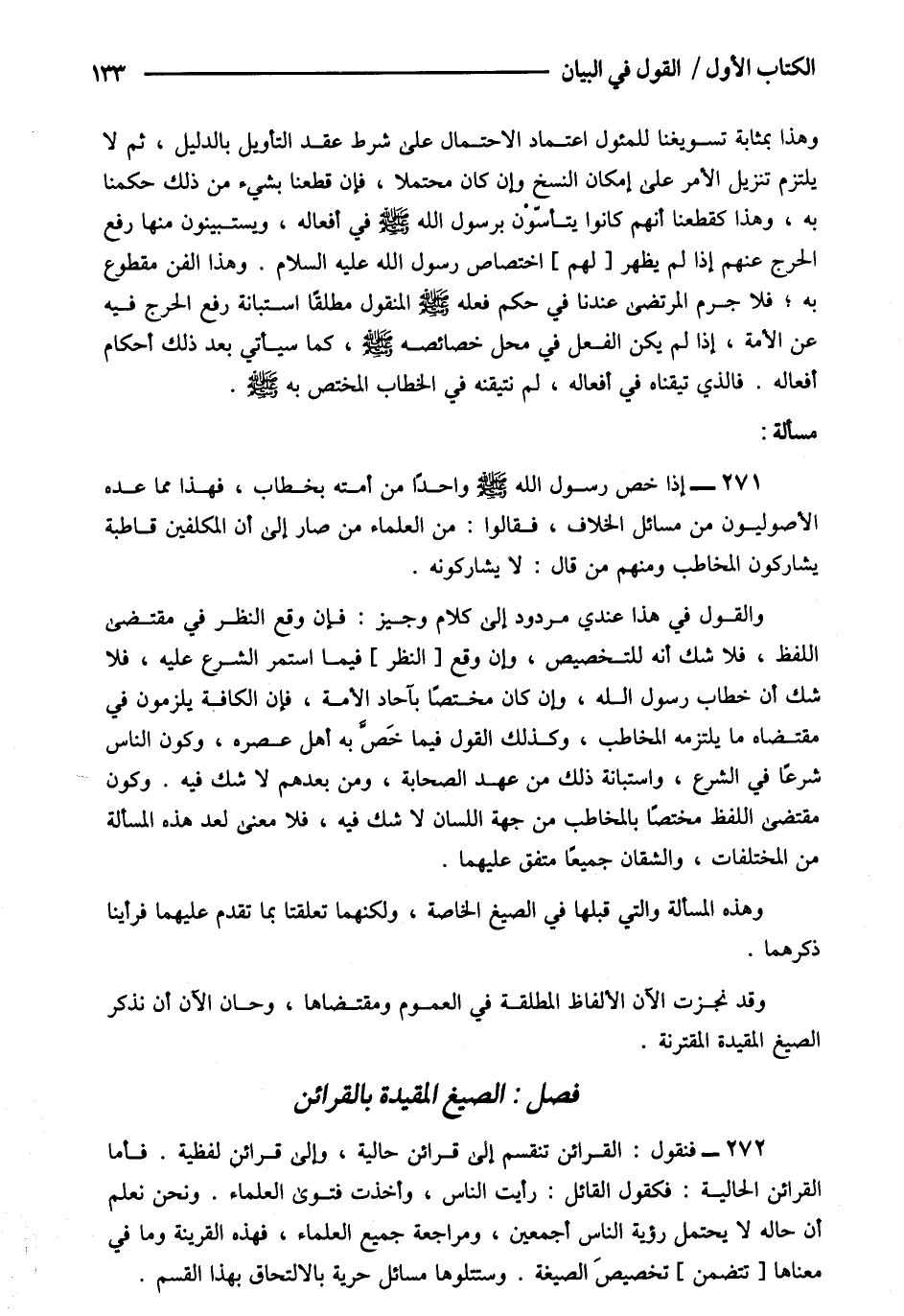 272- فنقول: القرائن تنقسم إلى قرائن حالية وإلى قرائن لفظيه فأما القرائن الحالية: فكقول القائل: رأيت الناس وأخذت فتوى العلماء ونحن نعلم أن حاله لا يحتمل رؤية الناس أجمعين ومراجعة جميع العلماء فهذه القرينة وما في معناها تتضمن تخصيص الصيغة وستتلوها مسائل حرية بالالتحاق بهذا القسم.