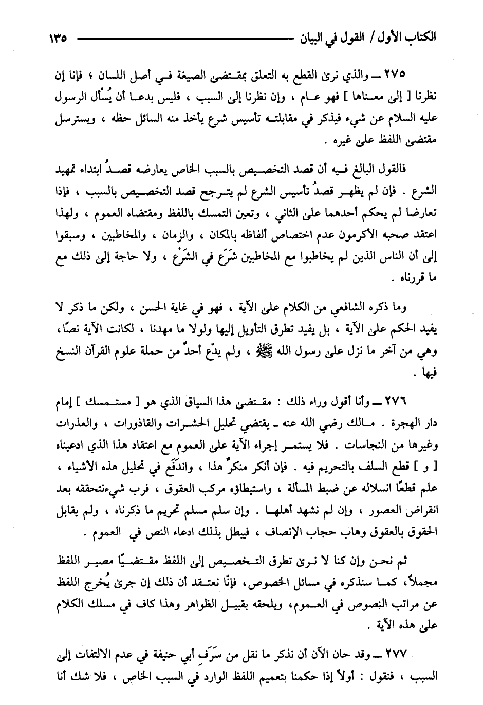 275- والذي نرى القطع به التعلق بمقتضى الصيغة في أصل اللسان فإنا إن نظرنا إلى معناها فهو عام وإن نظرنا إلى السبب فليس بدعا أن يسأل الرسول عليه السلام عن شيء فيذكر في مقابلته تأسيس شرع يأخذ منه السائل خطه ويسترسل مقتضى اللفظ على غيره.