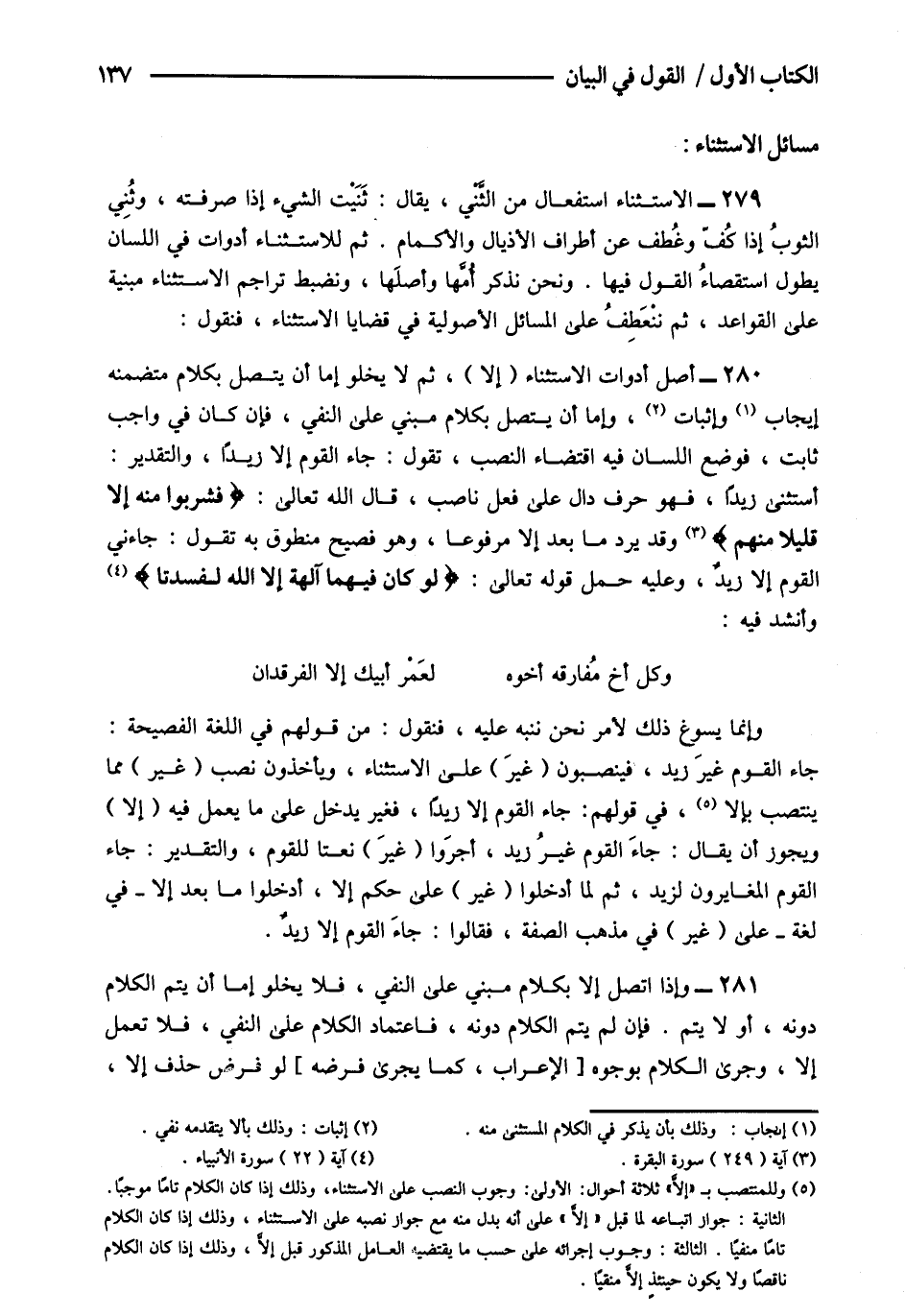 280- أصل أدوات الاستثناء "إلا" ثم لا يخلو إما أن يتصل بكلام متضمنه إيجاب1 وإثبات2 وإما أن يتصل بكلام مبني على النفي فإن كان في واجب ثابت فوضع اللسان فيه اقتضاء النصب تقول جاء القوم إلا زيدا والتقدير أستثنى زيدا فهو حرف دال على فعل ناصب قال الله تعالى: {فَشَرِبُوا مِنْهُ إِلَّا قَلِيلاً مِنْهُمْ} 3 وقد يرد ما بعد إلا مرفوعا وهو فصيح منطوق به تقول جاءني القوم إلا زيد وعليه حمل قوله تعالى: {لَوْ كَانَ فِيهِمَا آلِهَةٌ إِلَّا اللَّهُ لَفَسَدَتَا} 4 وأنشد فيه: