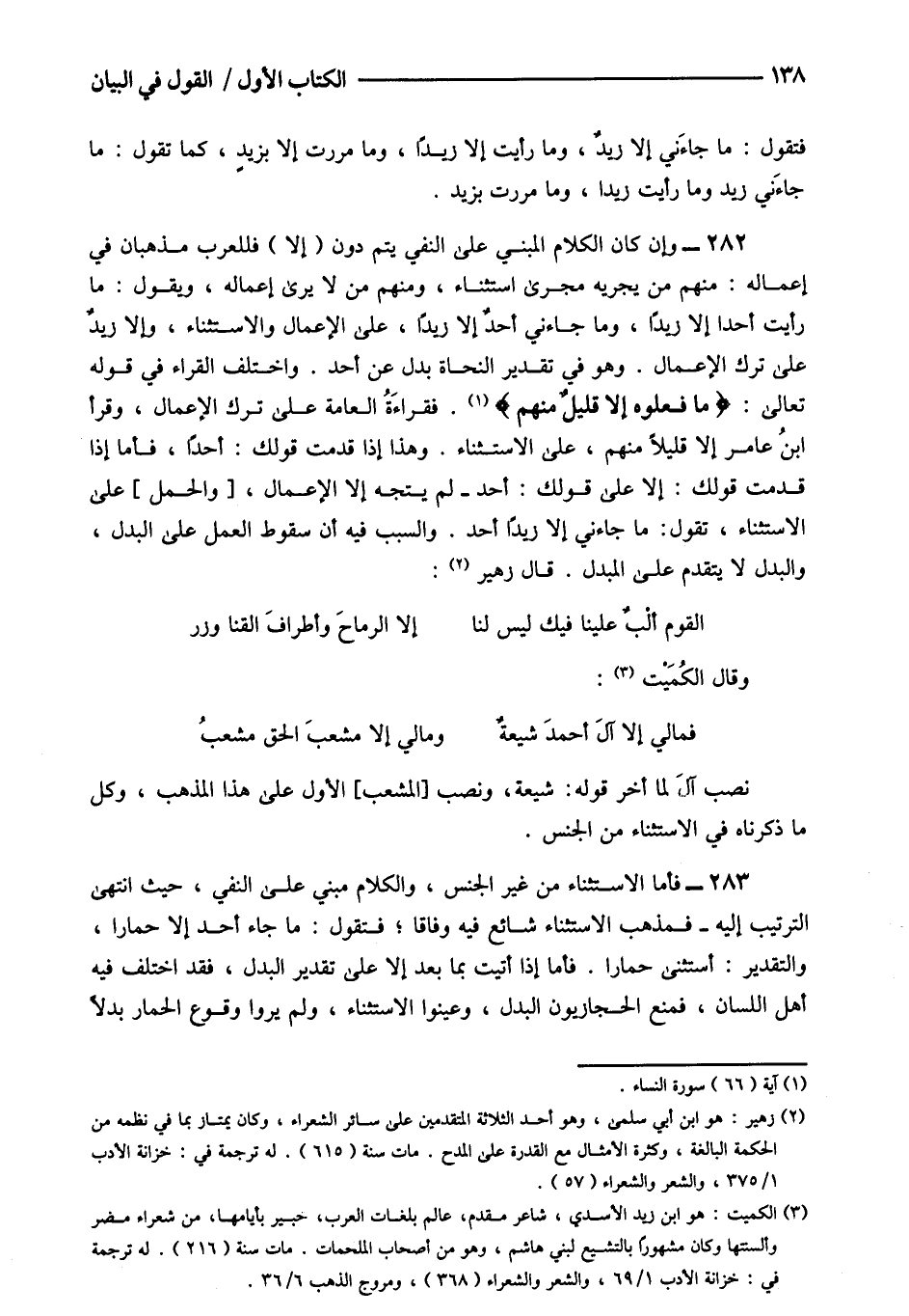 282- وإن كان الكلام المبني على النفي يتم دون "إلا" فللعرب مذهبان في إعماله منهم من يجريه مجرى استثناء ومنهم من لا يرى إعماله ويقول ما رأيت أحدا إلا زيدا وما جاءني أحد إلا زيدا على الإعمال والاستثناء وإلا زيد على ترك الإعمال وهو في تقدير النحاة بدل عن أحد واختلف القراء في قوله تعالى: {مَا فَعَلُوهُ إِلَّا قَلِيلٌ مِنْهُمْ} 1 فقراءة العامة على ترك الإعمال وقرأ ابن عامر إلا قليلا منهم على الاستثناء وهذا إذا قدمت قولك أحدا فأما إذا قدمت قولك: إلا على قولك أحد لم يتجه إلا الإعمال والحمل على الاستثناء تقول: ما جاءني إلا زيدا أحد والسبب فيه أن سقوط العمل على البدل والبدل لا يتقدم على المبدل قال زهير2: