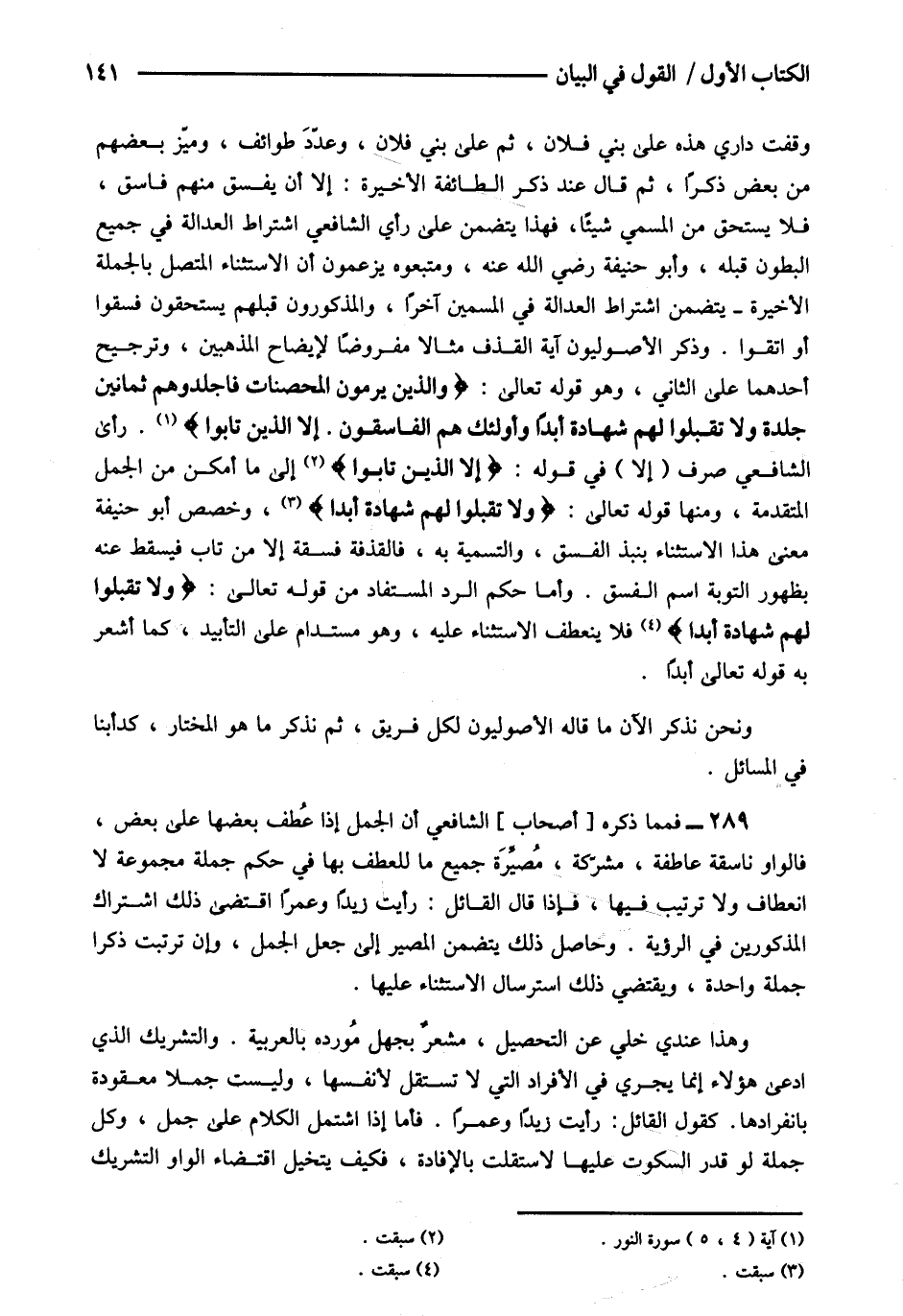 289- فمما ذكره [أصحاب] الشافعي أن الجمل إذا عطف بعضها على بعض فالواو ناسقة عاطفة مشركة مصيرة جميع ما للعطف بها في حكم جملة مجموعة لا انعطاف ولا ترتيب فيها فإذا قال القائل رأيت زيدا وعمرا اقتضى ذلك اشتراك المذكورين في الرؤية وحاصل ذلك يتضمن المصير إلى جعل الجمل وإن ترتبت ذكرا جملة واحدة ويقتضي ذلك استرسال الاستثناء عليها.