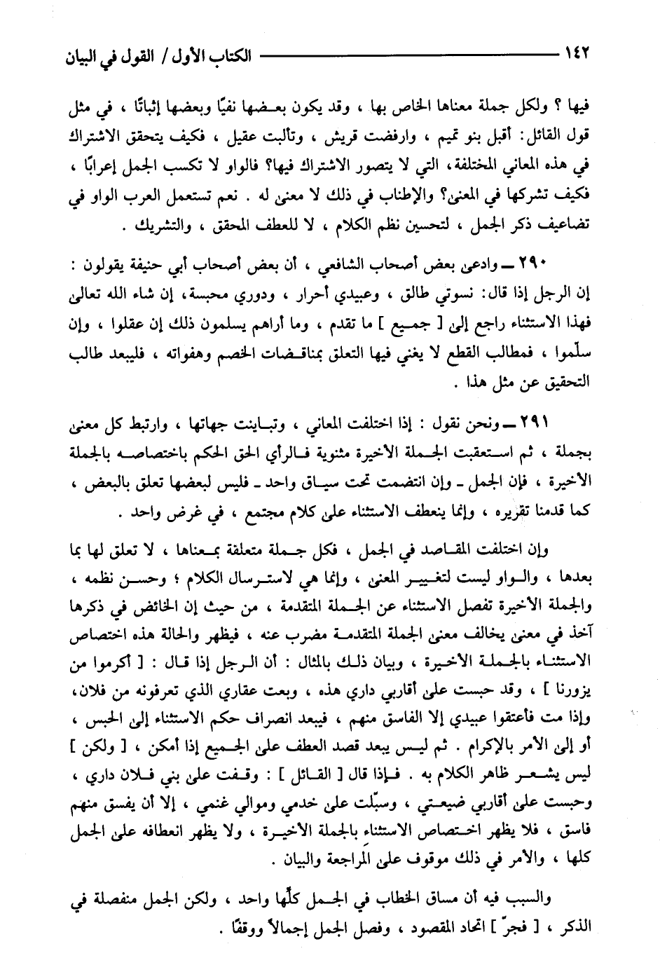 291- ونحن نقول: إذا اختلفت المعاني وتباينت جهاتها وارتبط كل معنى بجملة ثم استعقبت الجملة الأخيرة مثنوية فالرأي الحق الحكم باختصاصه بالجملة الأخيرة فإن الجمل وإن انتظمت تحت سياق واحد فليس لبعضها تعلق بالبعض كما قدمنا تقريره وإنما ينعطف الاستثناء على كلام مجتمع في غرض واحد.