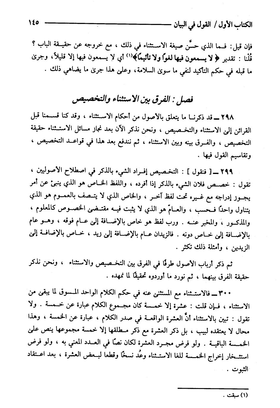 298- قد ذكرنا ما يتعلق بالأصول من أحكام الاستثناء وقد كنا قسمنا قبل القرائن إلى الاستثناء والتخصيص ونحن نذكر الآن بعد نجاز مسائل الاستثناء حقيقة التخصيص والفرق بينه وبين الاستثناء ثم نندفع بعد هذا في قواعد التخصيص وتقاسيم القول فيها.