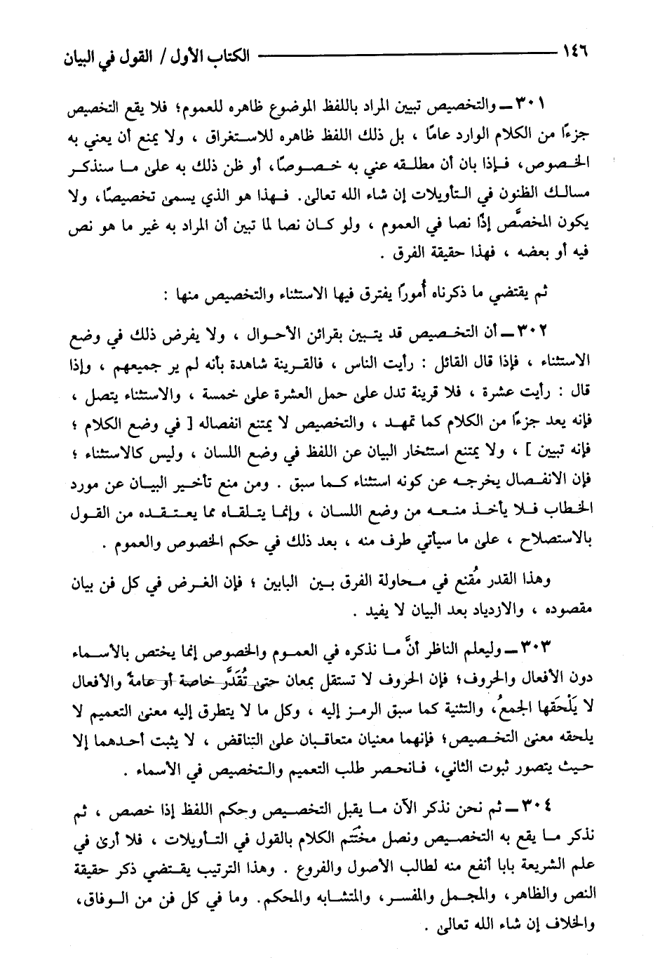 304- ثم نحن نذكر الآن ما يقبل التخصيص وحكم اللفظ إذا خصص ثم نذكر ما يقع به التخصيص ونصل مختتم الكلام بالقول في التأويلات فلا أرى في علم الشريعة بابا أنفع منه لطالب الأصول والفروع وهذا الترتيب يقتضي ذكر حقيقة النص والظاهر والمجمل والمفسر والمتشابه والمحكم وما في كل فن من الوفاق والخلاف إن شاء الله تعالى.