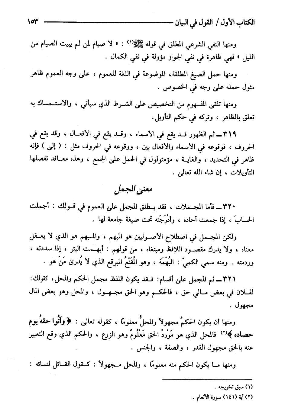 319- ثم الظهور قد يقع في الأسماء وقد يقع في الأفعال وقد يقع في الحروف فوقوعه في الأسماء والأفعال بين ووقوعه في الحروف مثل: "إلى" فإنه ظاهر في التحديد والغاية مؤول في الحمل على الجمع وهذه معاقد تفصلها التأويلات إن شاء الله تعالى.
