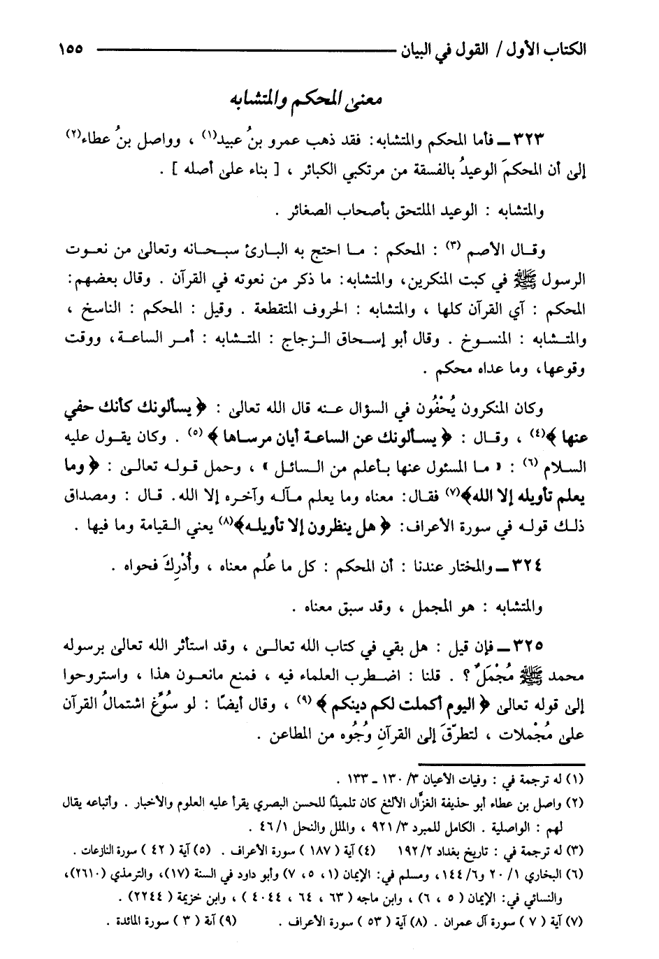 323- فأما المحكم والمتشابه فقد ذهب عمرو بن عبيد1 وواصل بن عطاء2 إلى أن المحكم الوعيد بالفسقة من مرتكبي الكبائر [بناء على أصله] .