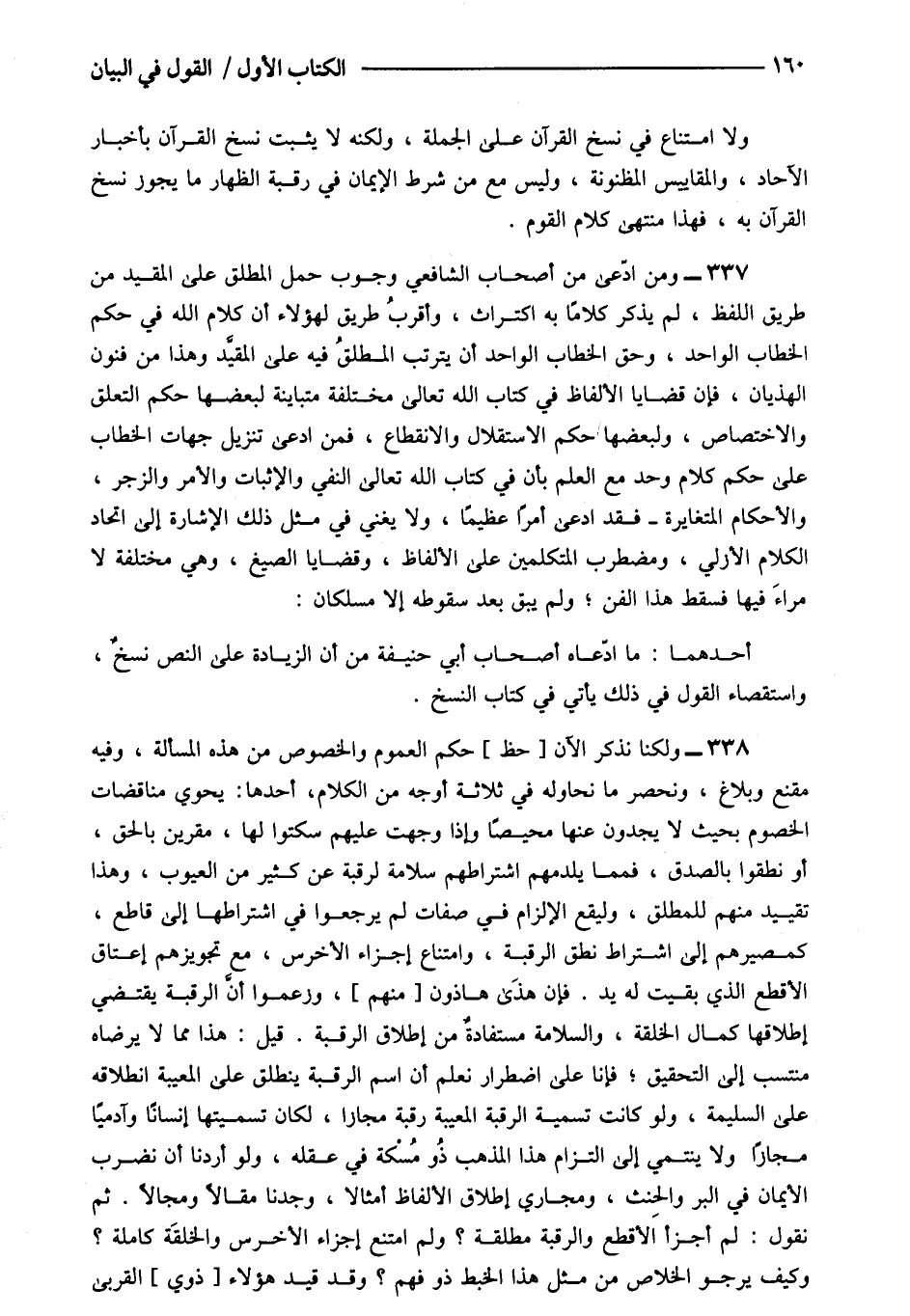 338- ولكنا نذكر الآن [حظ] حكم العموم والخصوص من هذه المسألة وفيه مقنع وبلاغ ونحصر ما نحاوله في ثلاثة أوجه من الكلام أحدهما يحوي مناقضات الخصوم بحيث لا يجدون عنها محيصا وإذا وجهت عليهم سكتوا لها مقرين بالحق أو نطقوا بالصدق فمما يلزمهم اشتراطهم سلامة الرقبة عن كثير من العيوب وهذا تقييد منهم للمطلق وليقع الإلزام في صفات لم يرجعوا في اشتراطها إلى قاطع كمصيرهم إلى اشتراط نطق الرقبة وامتناع إجزاء الأخرس مع تجويزهم إعتاق الأقطع الذي بقيت له يد فإن هذي هاذون [منهم] وزعموا أن الرقبة يقتضي إطلاقها كمال الخلقة والسلامة مستفادة من إطلاق الرقبة قيل هذا مما لا يرضاه منتسب إلى التحقيق فإنا على اضطرار نعلم أن اسم الرقبة ينطلق على المعيبة انطلاقه على السليمة ولو كانت تسمية الرقبة المعيبة رقبة مجازا لكان تسميتها إنسانا وآدميا مجازا ولا ينتمي إلى التزام هذا المذهب ذو مسكة في عقله ولو أردنا أن نضرب الأيمان في البر والحنث ومجاري إطلاق الألفاظ وجدنا مقالا ومجالا ثم نقول لم أجزأ الأقطع والرقبة مطلقة؟ ولم امتنع إجزاء الأخرس والخلقة كاملة؟ وكيف يرجو الخلاص من مثل هذا الخبط ذو فهم؟ وقد قيد هؤلاء [ذوي] القربى.