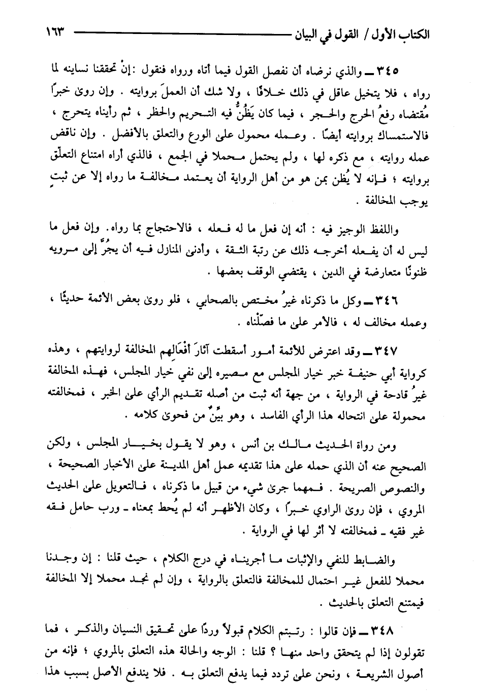 348- فإن قالوا: رتبتم الكلام قبولا وردا على تحقيق النسيان والذكر فما تقولون إذا لم يتحقق واحد منها؟ قلنا: الوجه والحالة هذه التعلق بالمروى فإنه من أصول الشريعة ونحن على تردد فيما يدفع التعلق به فلا يندفع الأصل بسبب هذا.