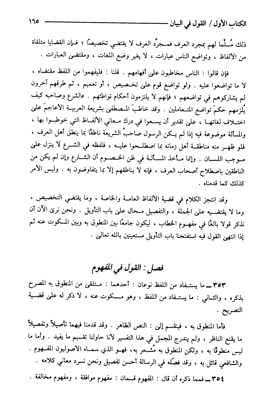 353- ما يستفاد من اللفظ نوعان أحدهما متلقى من المنطوق به المصرح بذكره والثاني ما يستفاد من اللفظ وهو مسكوت عنه لا ذكر له على قضية التصريح.
