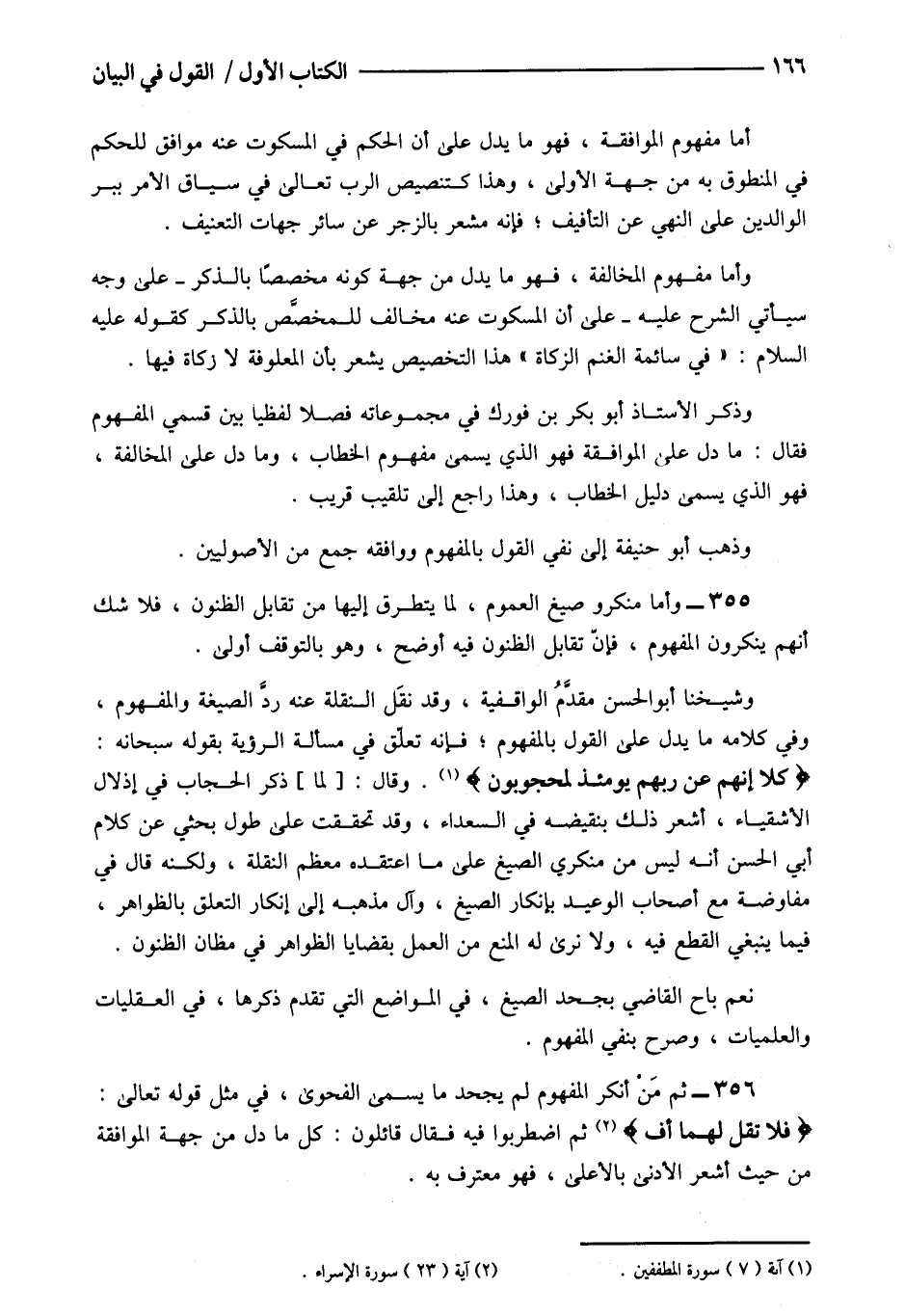 356- ثم من أنكر المفهوم لم يجحد ما يسمى الفحوى في مثل قوله تعالى: {فَلا تَقُلْ لَهُمَا أُفٍّ} 2 ثم اضطربوا فيه فقال قائلون كل ما دل من جهة الموافقة من حيث أشعر الأدنى بالأعلى فهو معترف به.