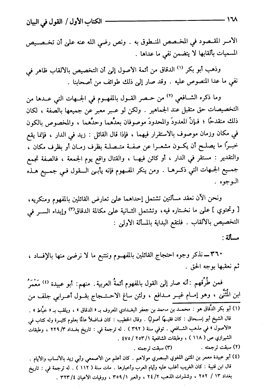 ونحن الآن نعقد مسألتين تشتمل إحداهما على تعارض القائلين بالمفهوم ومنكريه [وتحتوي] على ما نختاره فيه وتشتمل الثانية على مكالمة الدقاق3 وإبداء السر في التخصيص بالألقاب فلتقع البداية بالمسألة الأولى:.
