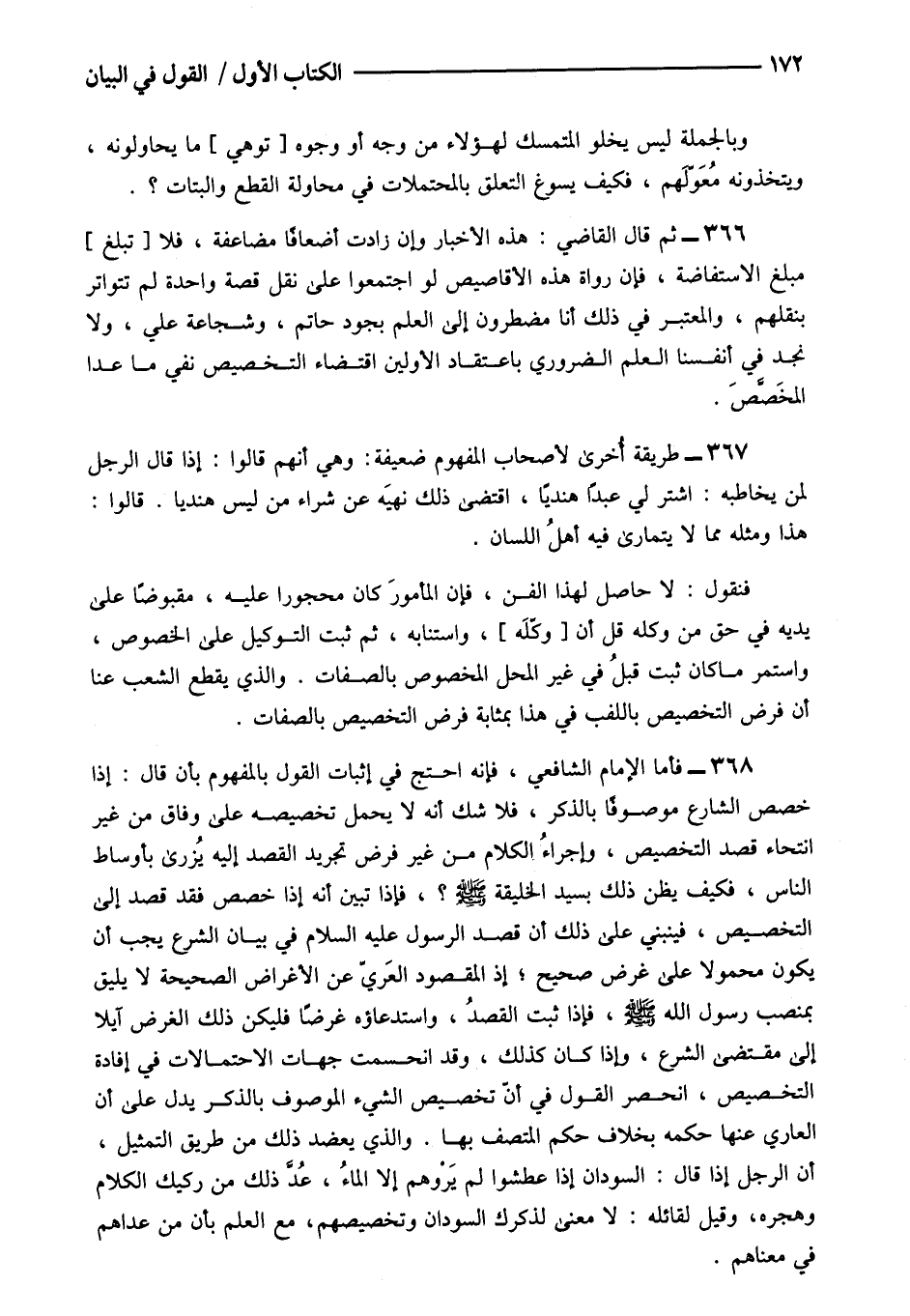 367- طريقة أخرى لأصحاب المفهوم ضعيفة: وهي أنهم قالوا: إذا قال الرجل لمن يخاطبه: اشتر لي عبدا هنديا اقتضى ذلك نهيه عن شراء من ليس هنديا قالوا هذا ومثله مما لا يتمارى فيه أهل اللسان.