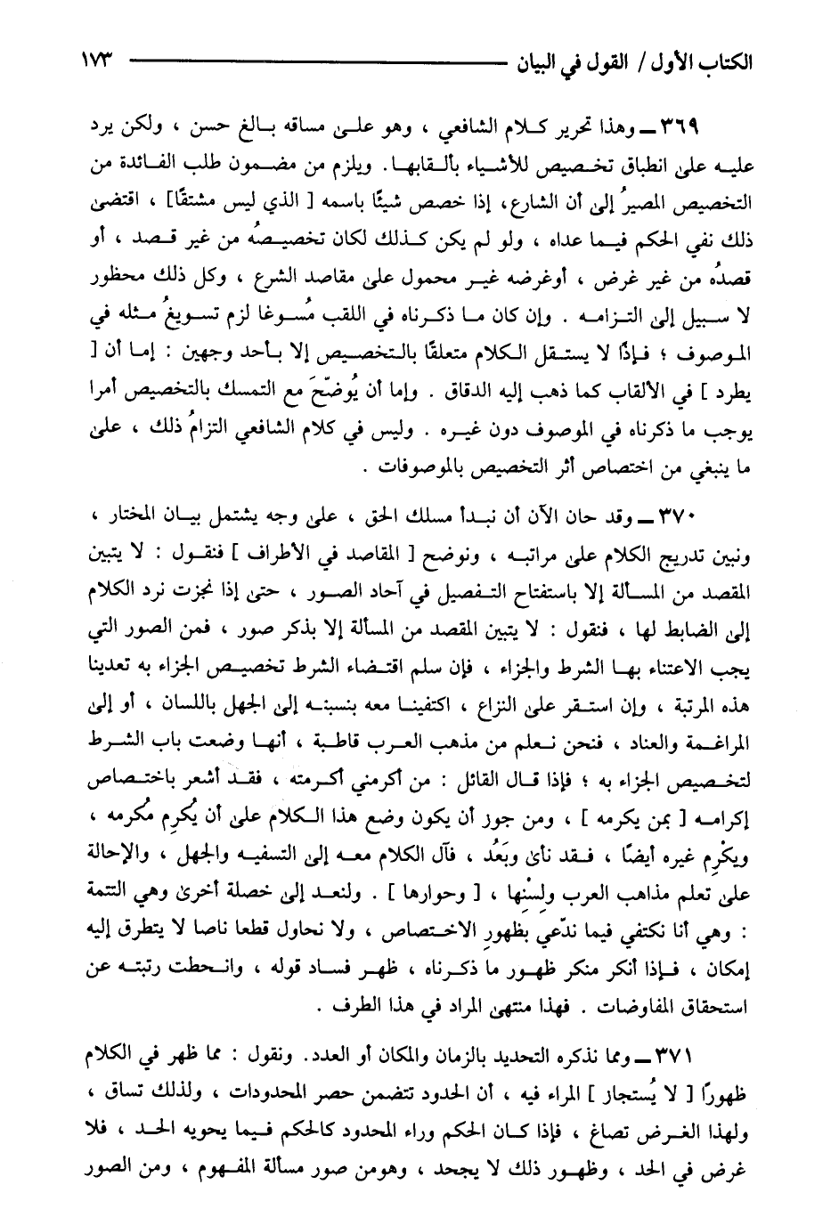 371- ومما نذكره التحديد بالزمان والمكان أو العدد ونقول مما ظهر في الكلام ظهورا لا يستجاز المراء فيه أن الحدود تتضمن حصر المحدودات ولذلك تساق ولهذا الغرض تصاغ فإذا كان الحكم وراء المحدود كالحكم فيما يحويه الحد فلا غرض في الحد وظهور ذلك لا يجحد وهو من صور مسألة المفهوم ومن الصور.