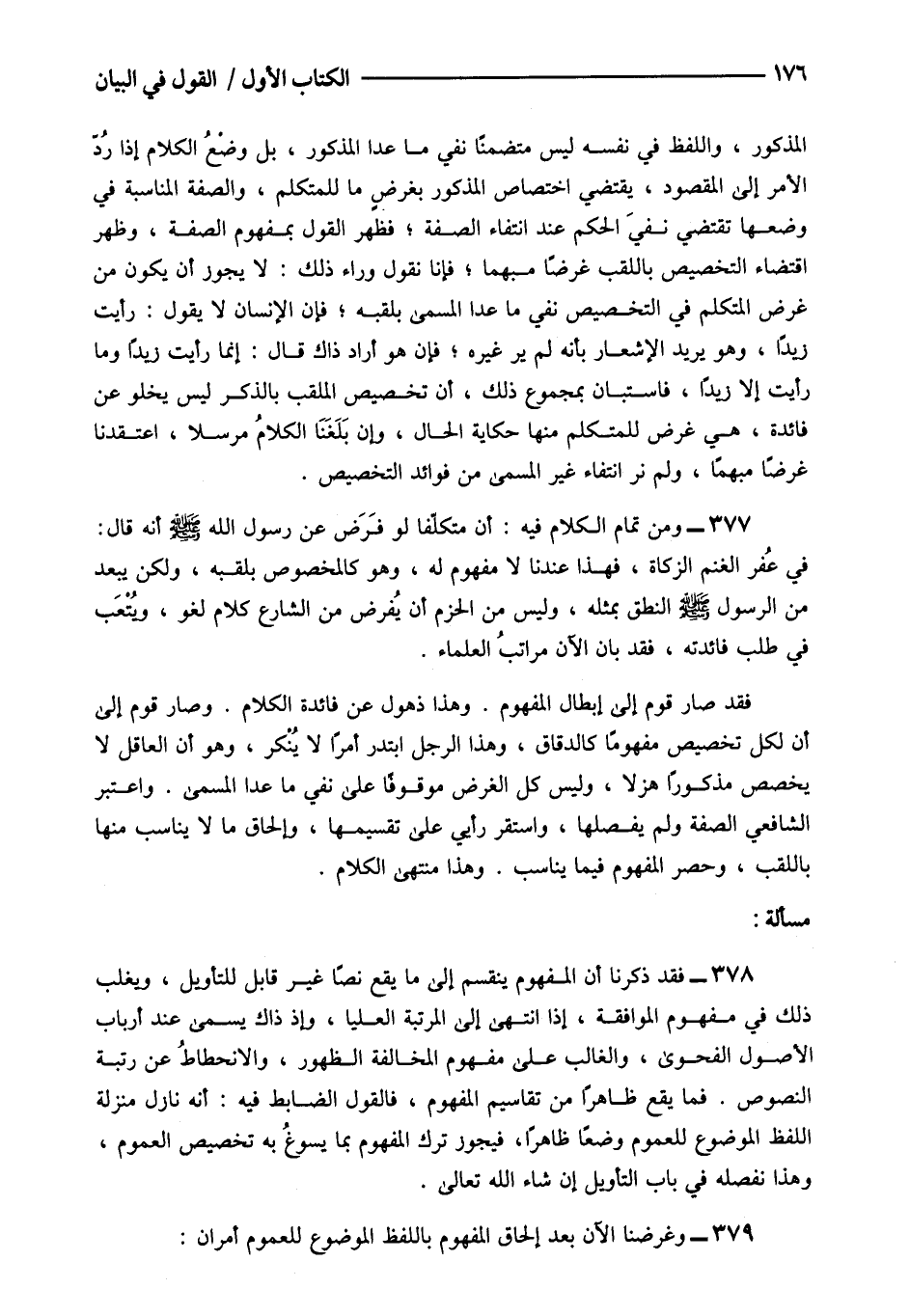 377- ومن تمام الكلام فيه أن متكلفا لو فرض عن رسول الله صلى الله عليه وسلم أنه قال: في عفر الغنم الزكاة فهذا عندنا لا مفهوم له وهو كالمخصوص بلقبه ولكن يبعد من الرسول صلى الله عليه وسلم النطق بمثله وليس من الحزم أن يفرض من الشارع كلام لغو ويتعب في طلب فائدته فقد بان الآن مراتب العلماء.