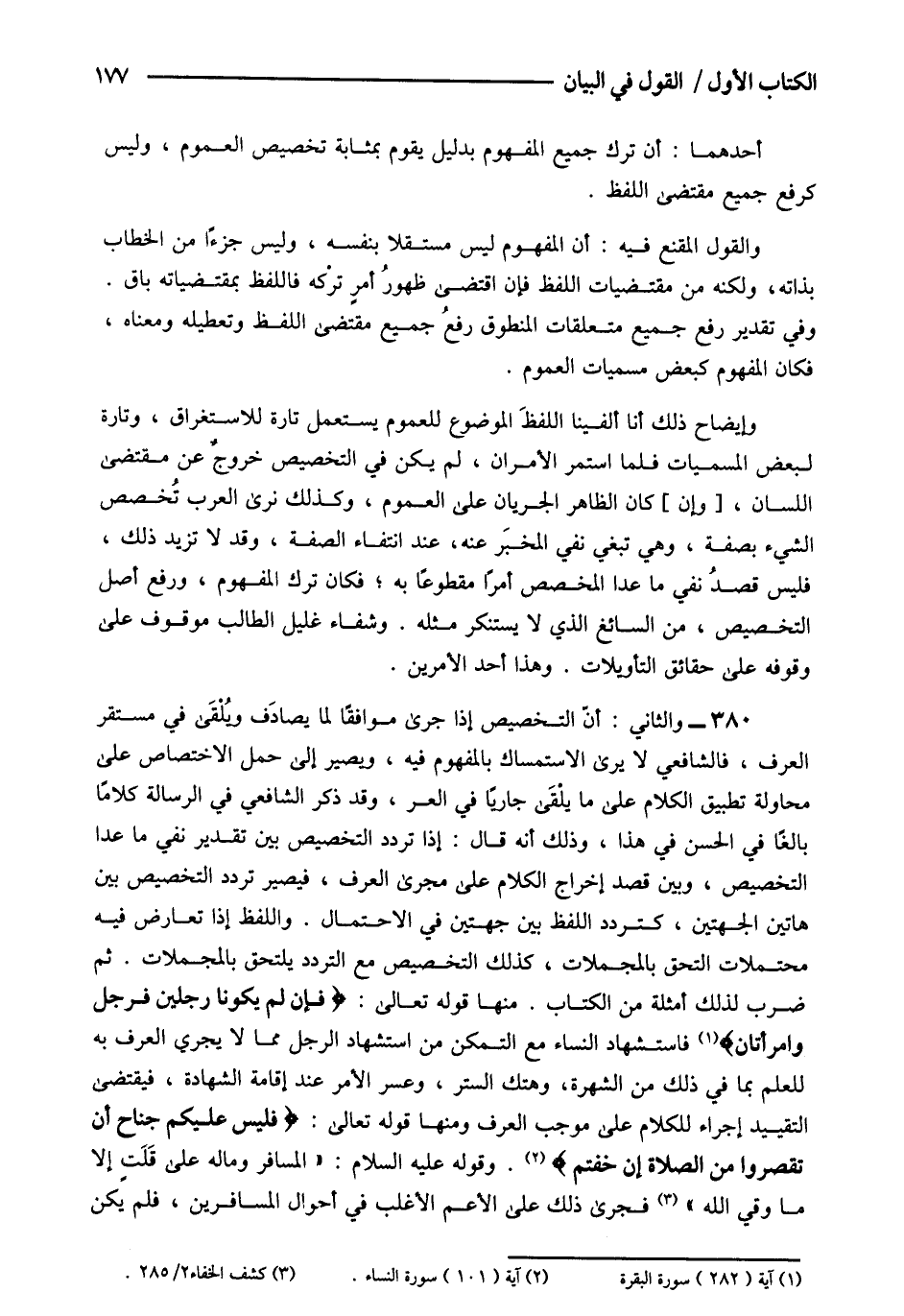 وإيضاح ذلك أنا ألفينا اللفظ الموضوع للعموم يستعمل تارة للاستغراق وتارة لبعض المسميات فلما استمر الأمران لم يكن في التخصيص خروج عن مقتضى اللسان [وإن] كان الظاهر الجريان على العموم وكذلك نرى العرب تخصص الشيء بصفة وهي تبغي نفي المخبر عنه عند انتفاء الصفة وقد لا تريد ذلك فليس قصد نفي ما عدا المخصص أمرا مقطوعا به فكان ترك المفهوم ورفع أصل التخصيص من السائغ الذي لا يستنكر مثله وشفاء غليل الطالب موقوف على وقوفه على حقائق التأويلات وهذا أحد الأمرين.