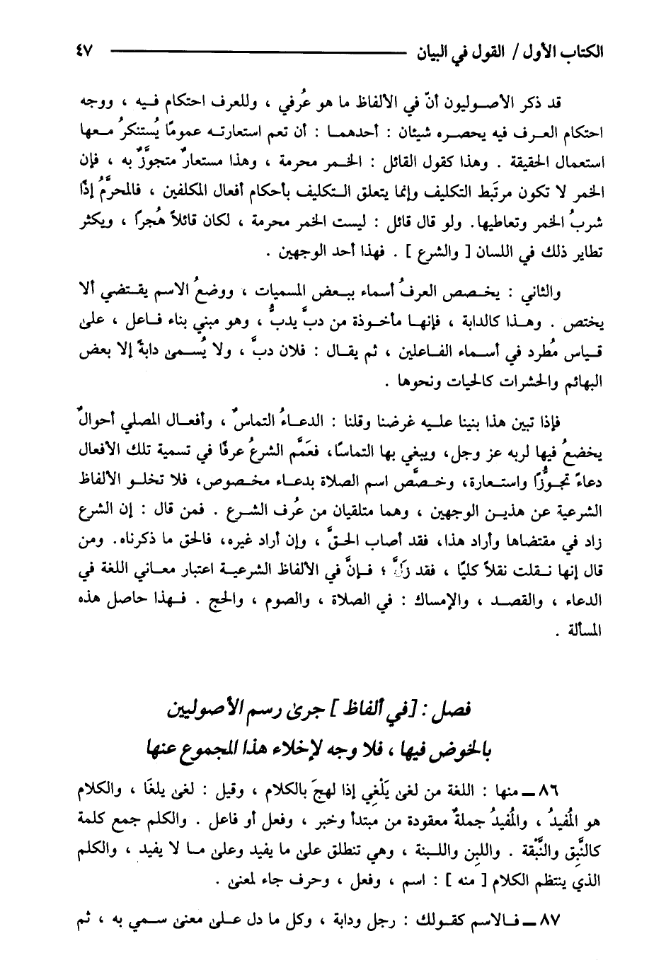 86- منها: اللغة من لغي يلغى إذا لهج بالكلام وقيل لغي يلغا والكلام هو المفيد والمفيد جملة معقودة من مبتدأ وخبر وفعل أو فاعل والكلم جمع كلمة كالنبق والنبقة واللبن واللبنة وهي تنطلق على ما يفيد وعلى مالا يفيد والكلم الذي ينتظم الكلام [منه] اسم وفعل وحرف جاء لمعنى.